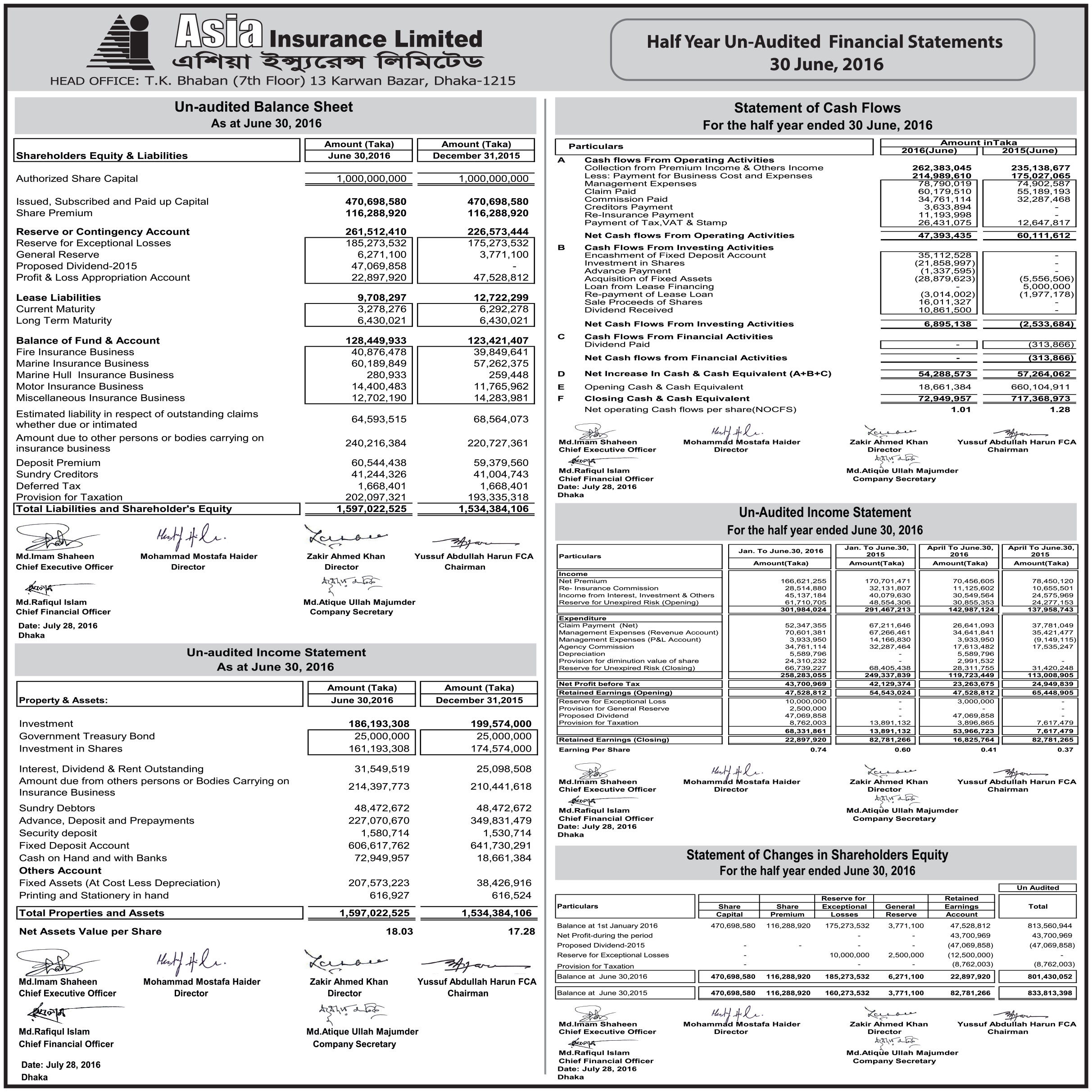 Half Yearly Un-audited Financial Statement of Asia Insurance Limited