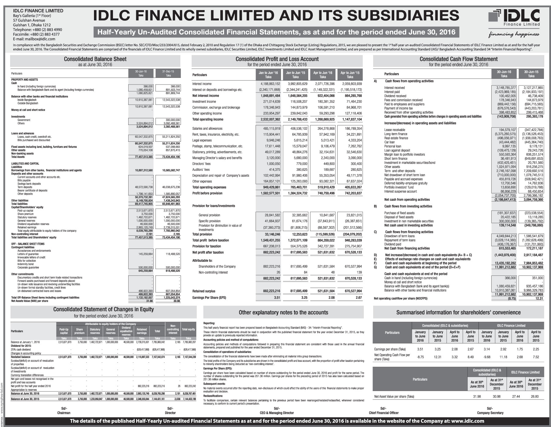 Half Yearly Un-audited Financial Statement of IDLC Finance and its Subsidiaries