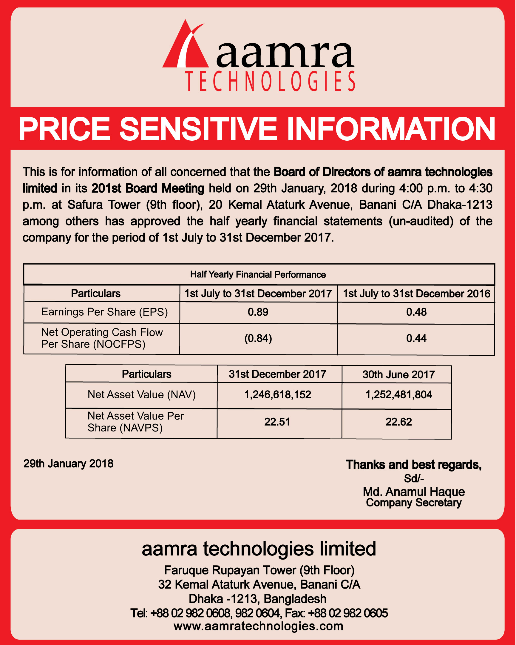 Half Yearly (Un-Audited) Financial Statements of aamra technologies limited