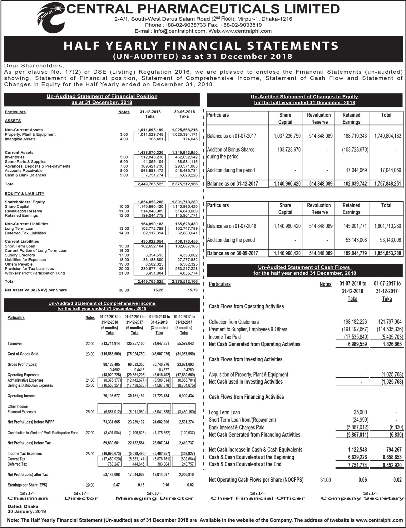 Half Yearly (Un-audited) Financial Statements of Central Pharmaceuticals Limited
