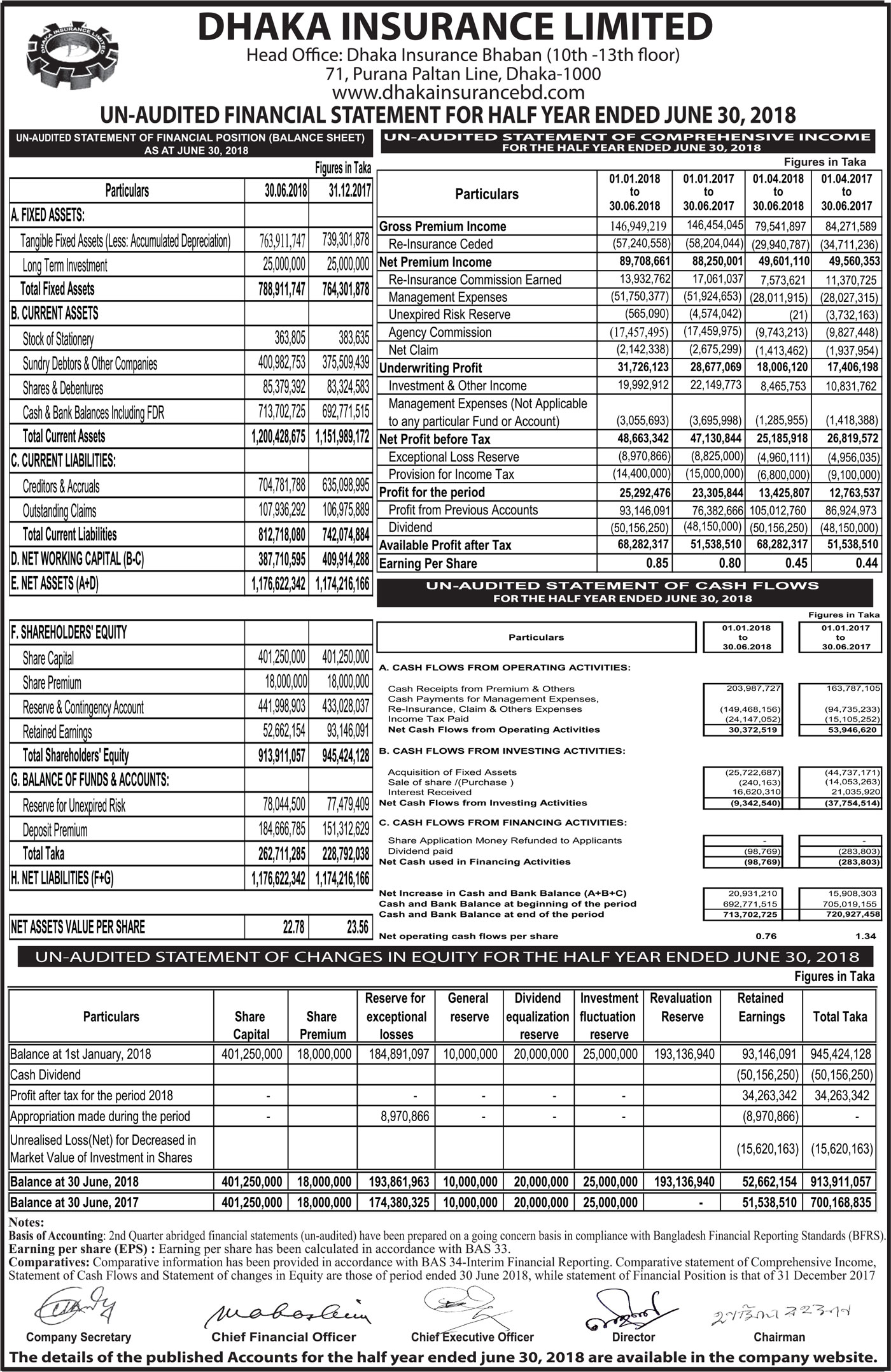 Half Yearly Un-audited Financial Statements of Dhaka Insurance Limited