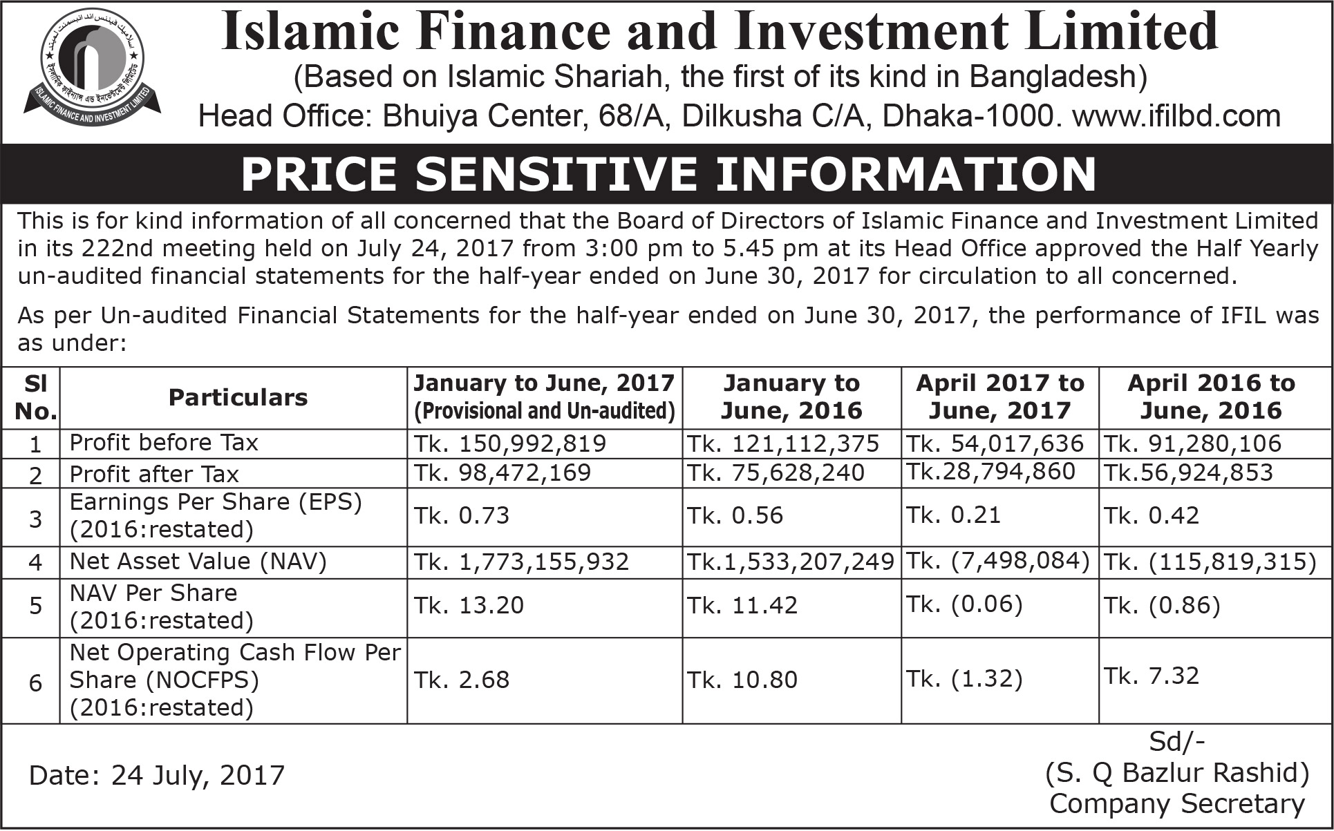 Price Sensitive Information of Islamic Finance & Investment Ltd