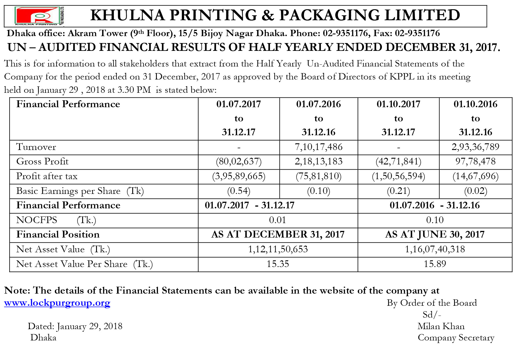 Un-audited Half Yearly Financial Results of Khulna Printing & Packaging Limited