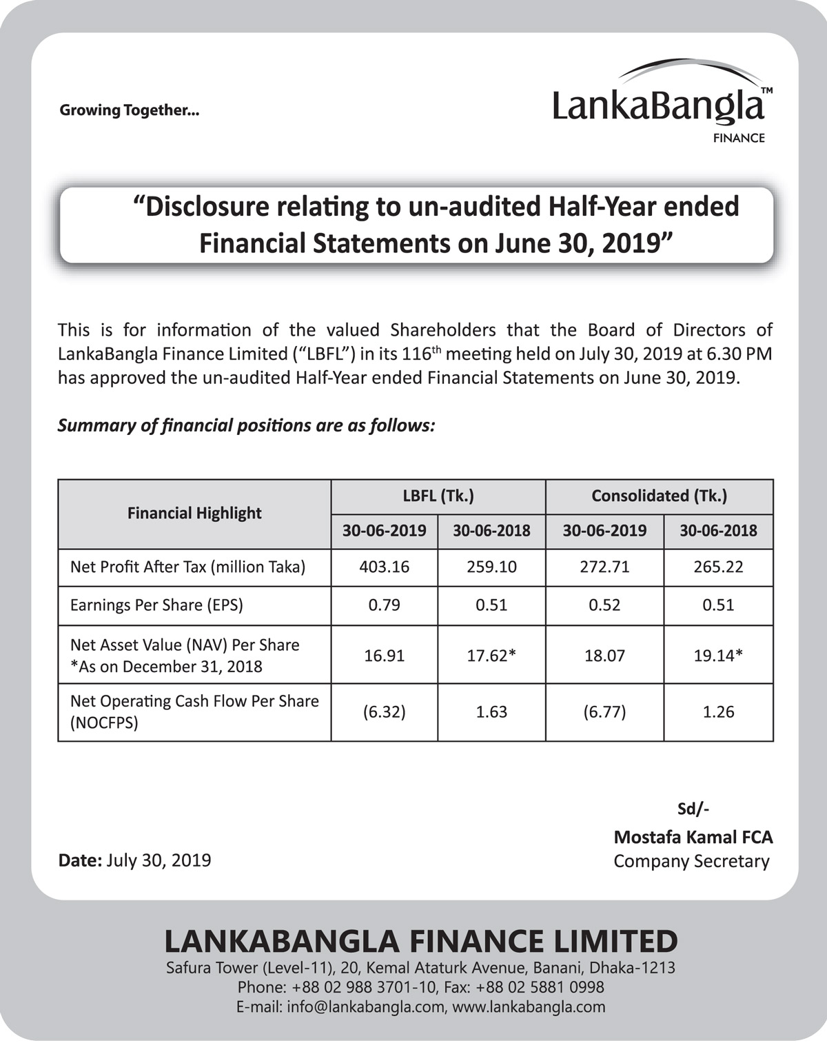 Half Yearly Un-audited Financial Statements of LankaBangla Finance ltd