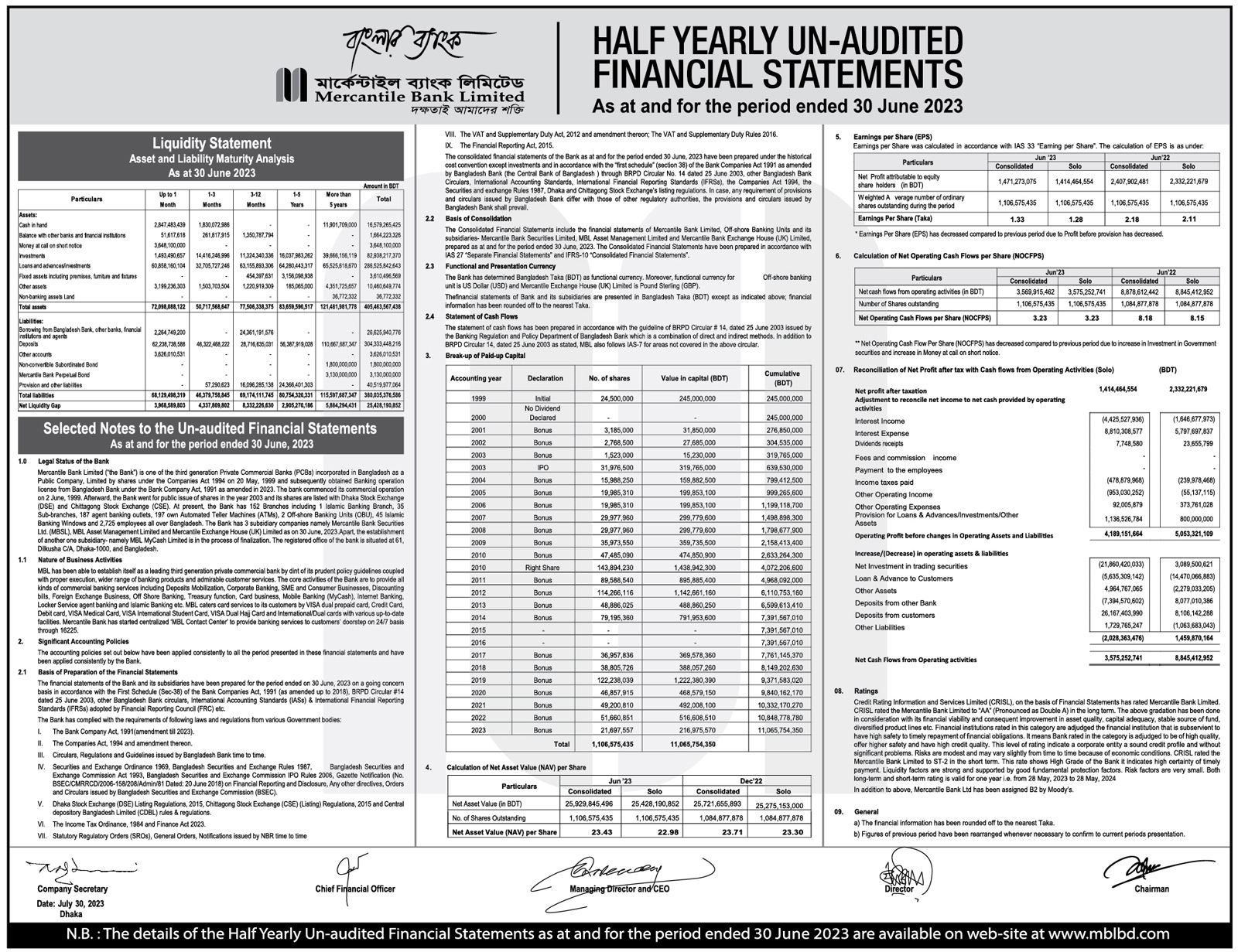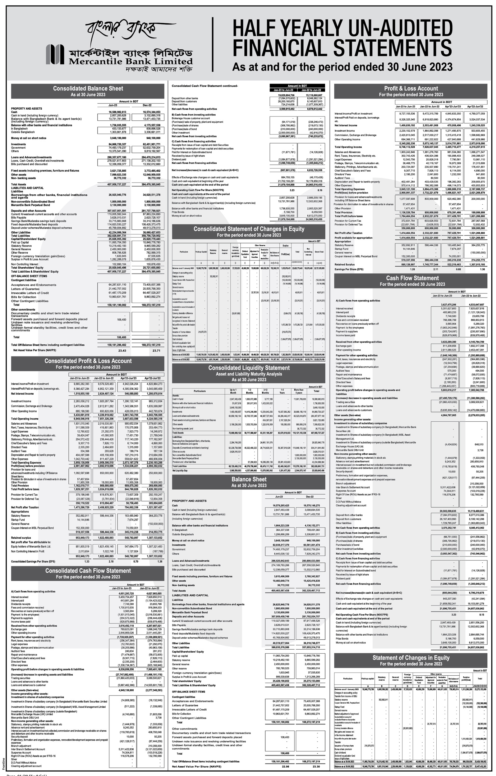 Half Yearly Un-audited Financial Statements of Mercantile Bank Limited