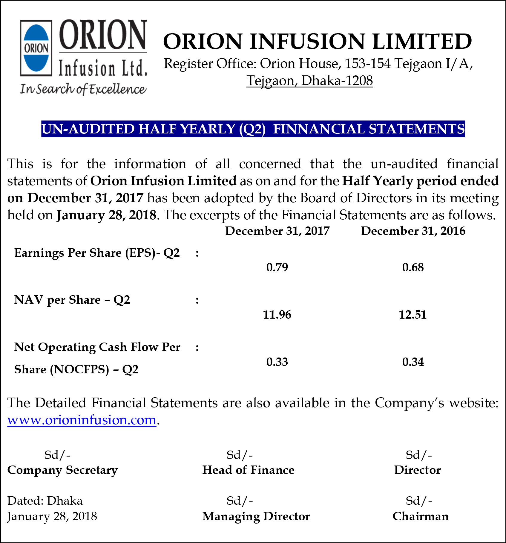 Un-audited Half Yearly (Q2) Financial Statements of Orion Infusion Ltd