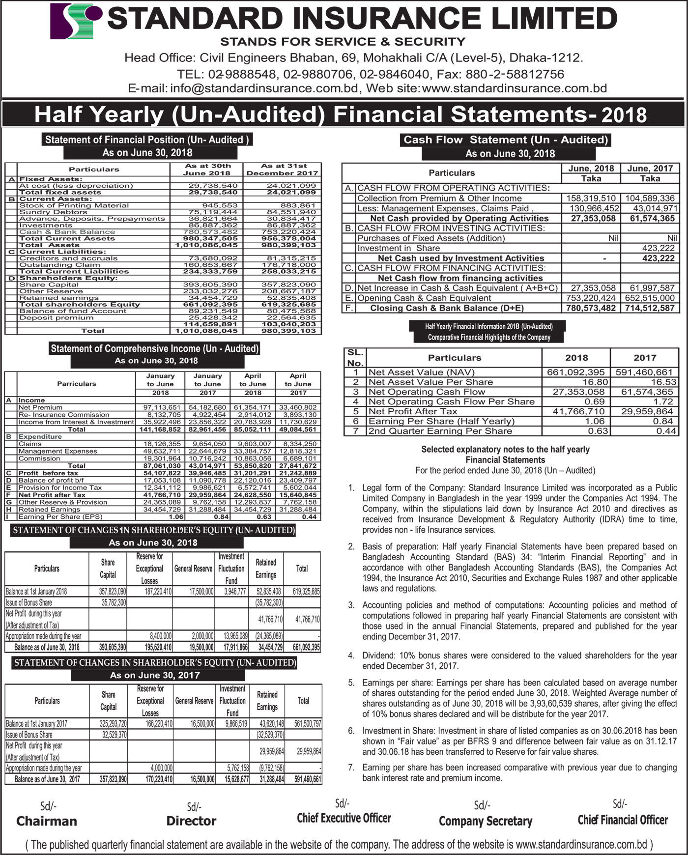 Half Yearly (Un-audited) Financial Statements of Standard Insurance Limited