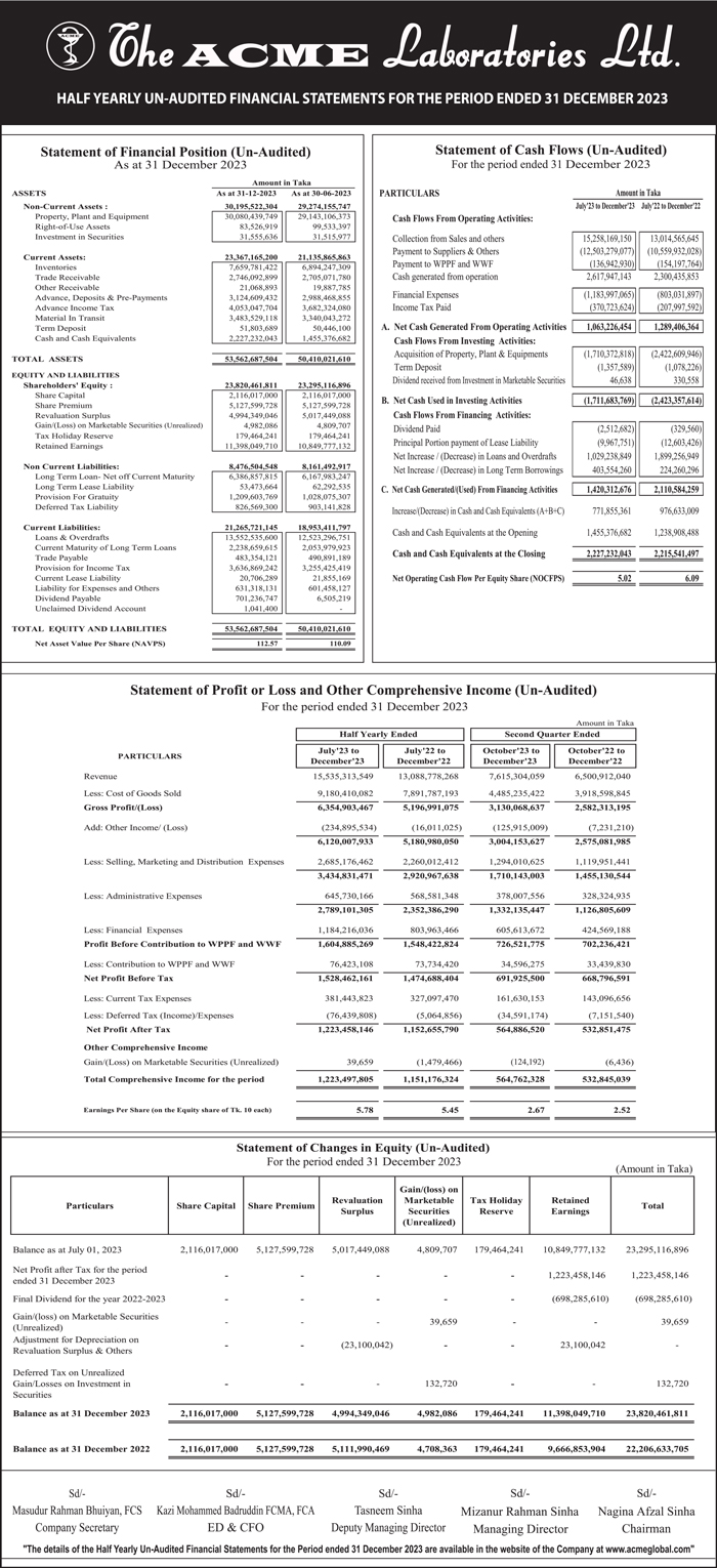 Half Yearly Un-audited Financial Statements of The ACME Laboratories Ltd.