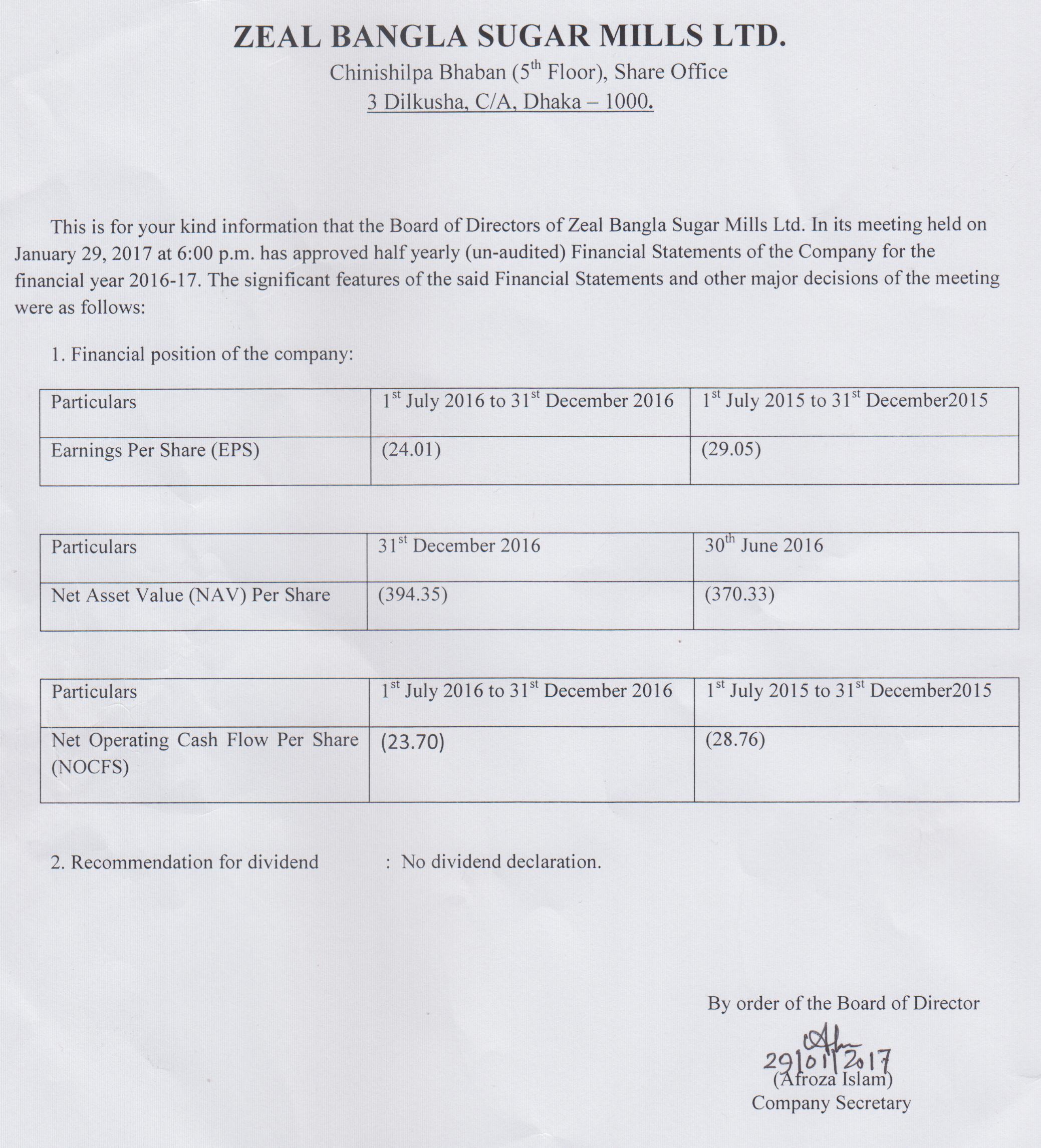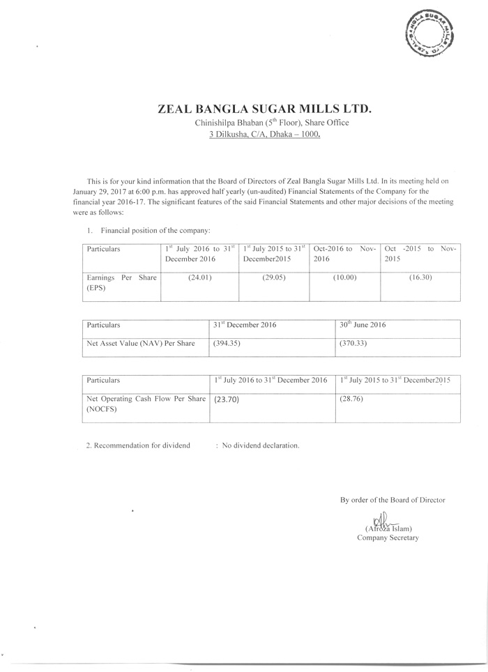 Half Yearly Financial Statements of Zeal Bangla Sugar Mills Ltd