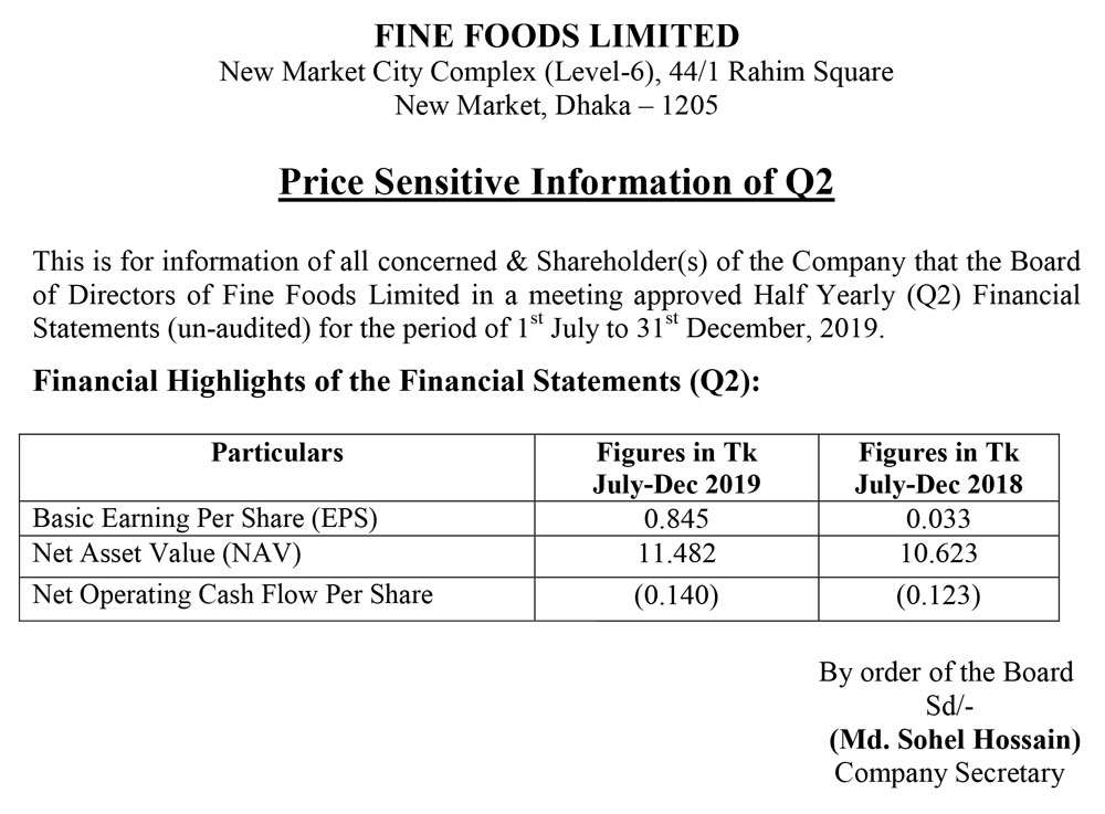 Price Sensitive Information (Q2) of Fine Foods Limited