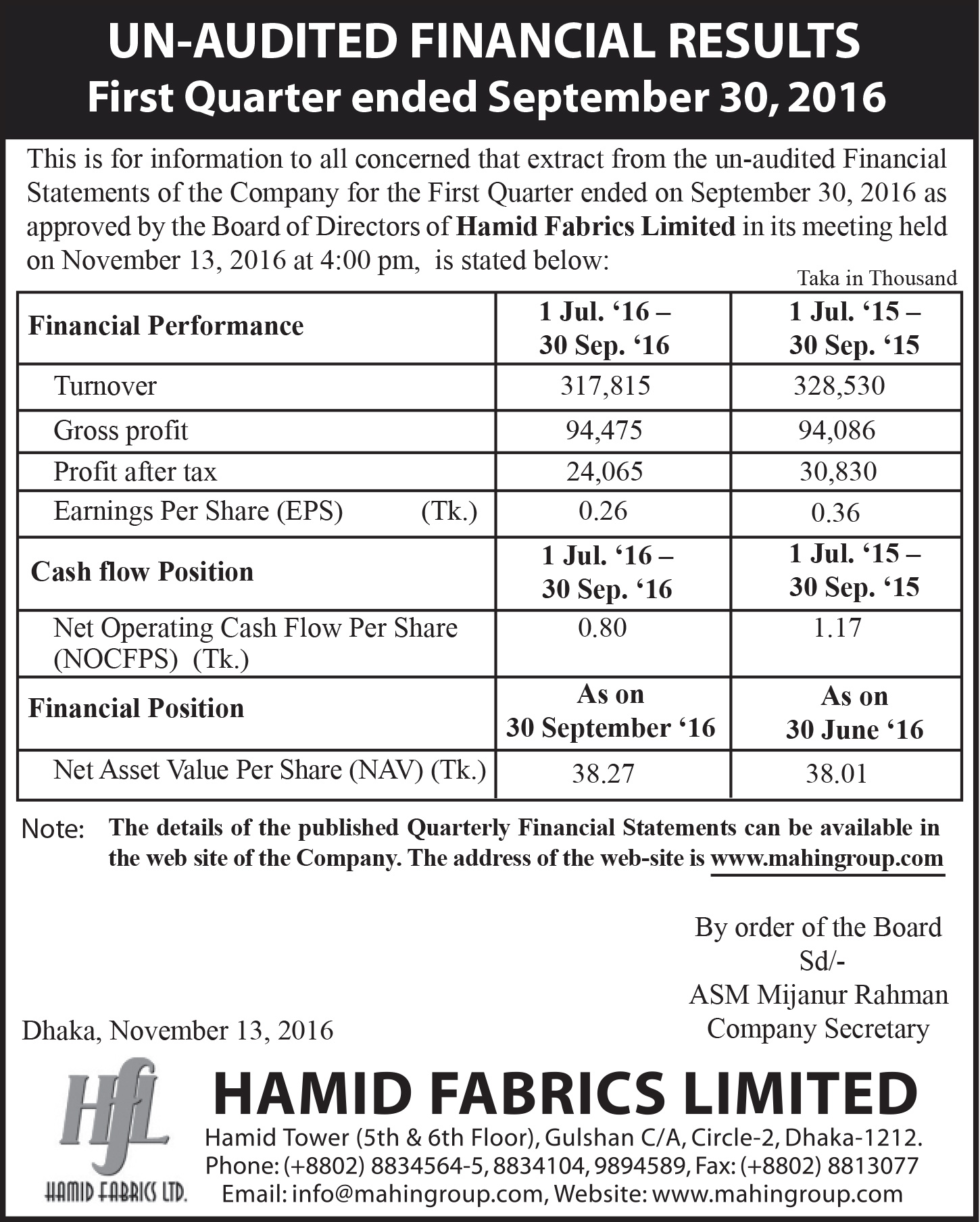 Q1 Financial Results (Un-audited) of Hamid Fabrics Limited