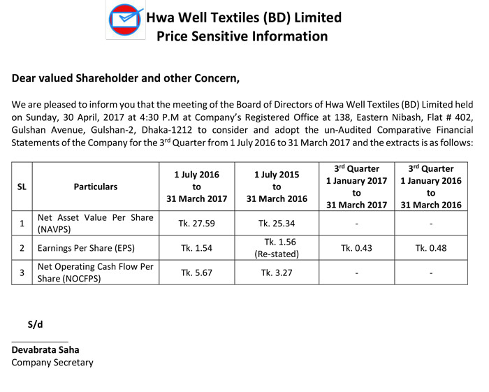 Price Sensitive Information of Hwa Well Textiles (BD) Limited