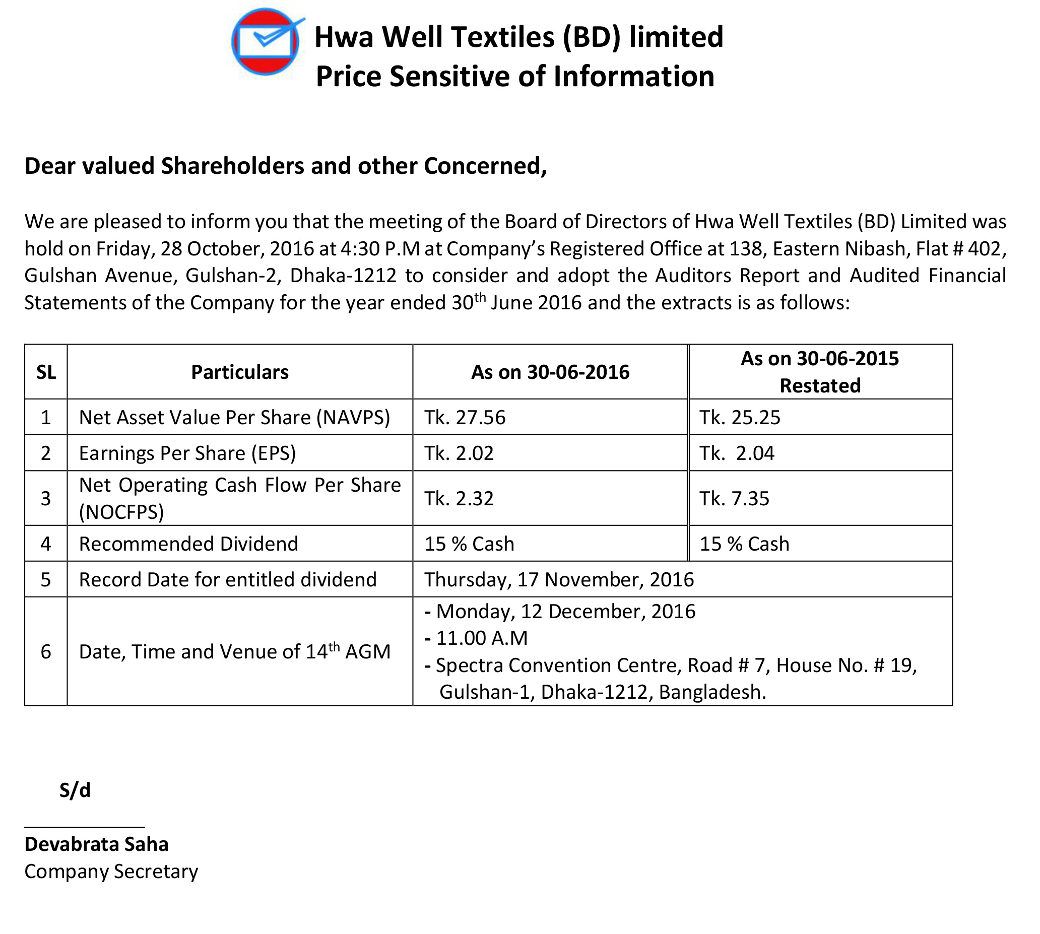 Hwa Well Textiles (BD) Limited Price Sensitive Information