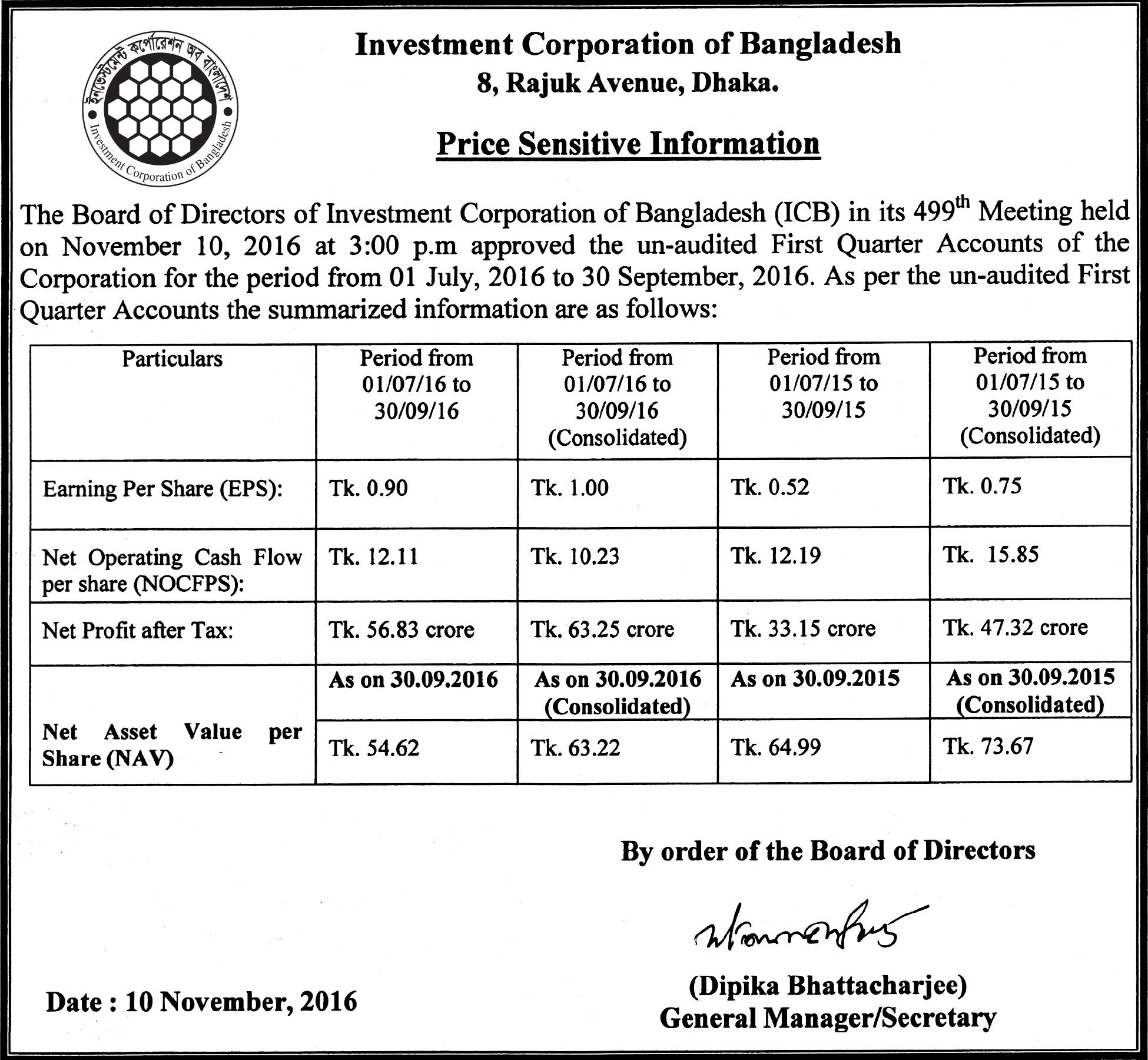 Price Sensitive Information of Investment Corporation of Bangladesh (ICB)