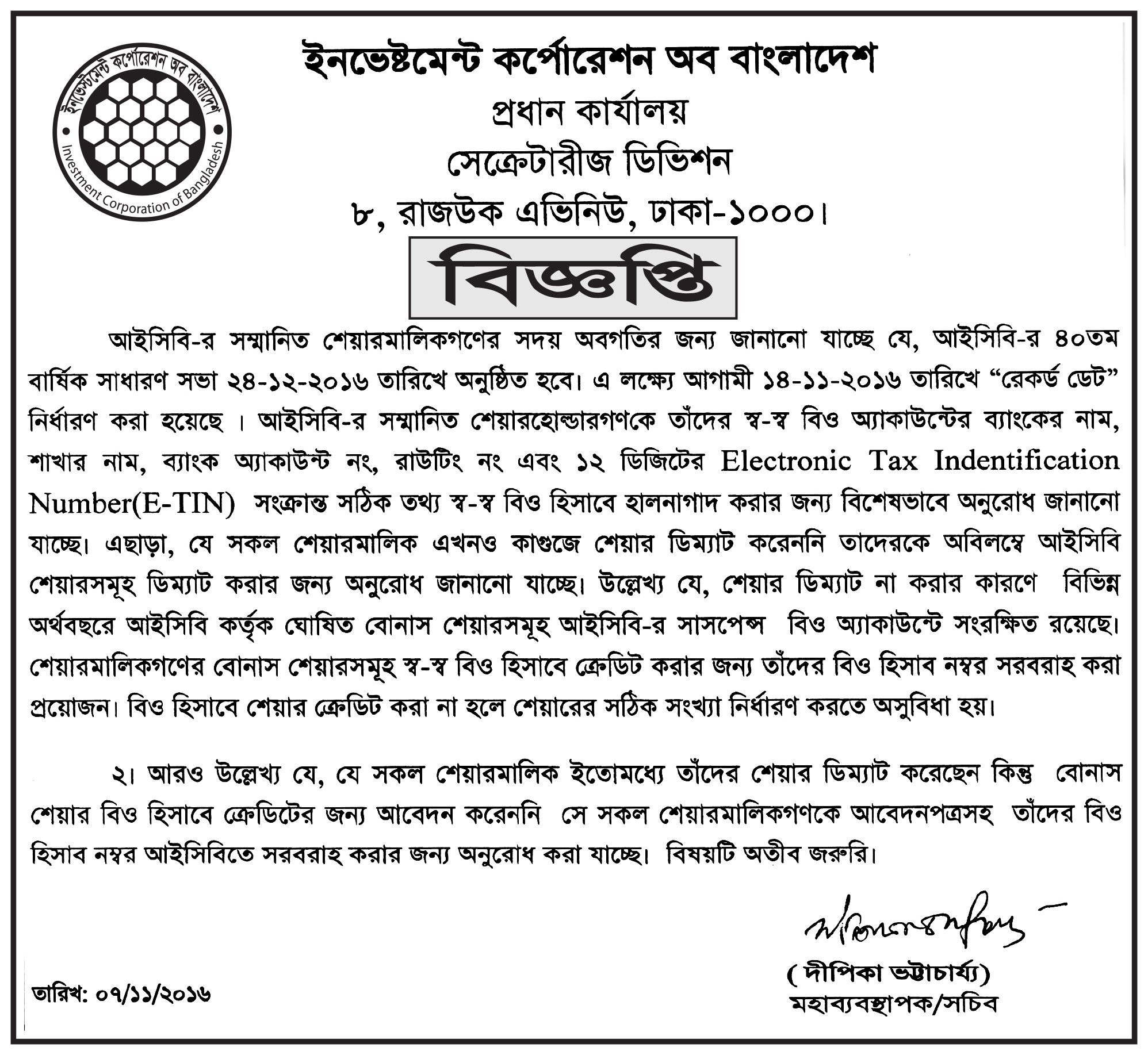Notice of the 48th AGM of Investment Corporation of Bangladesh (ICB)