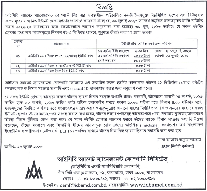 আইসিবি এএমসিএল এর ব্যবস্থাধীনে পরিচালিত নন-সিডিএস ভুক্ত ওপেন এন্ড মিউচ্যুয়াল ফান্ডসমূহের ২০২২-২০২৩ অর্থবছরের জন্য লভ্যাংশ অনুমোদন সংক্রান্ত বিজ্ঞপ্তি