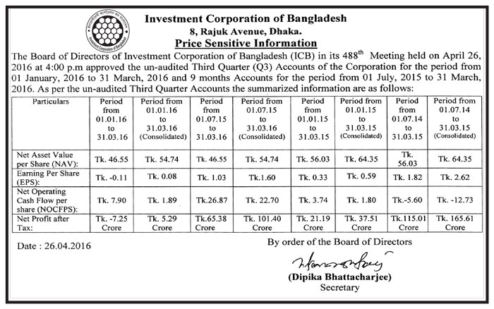 Price Sensitive Information of Investment Corporation of Bangladesh (ICB)
