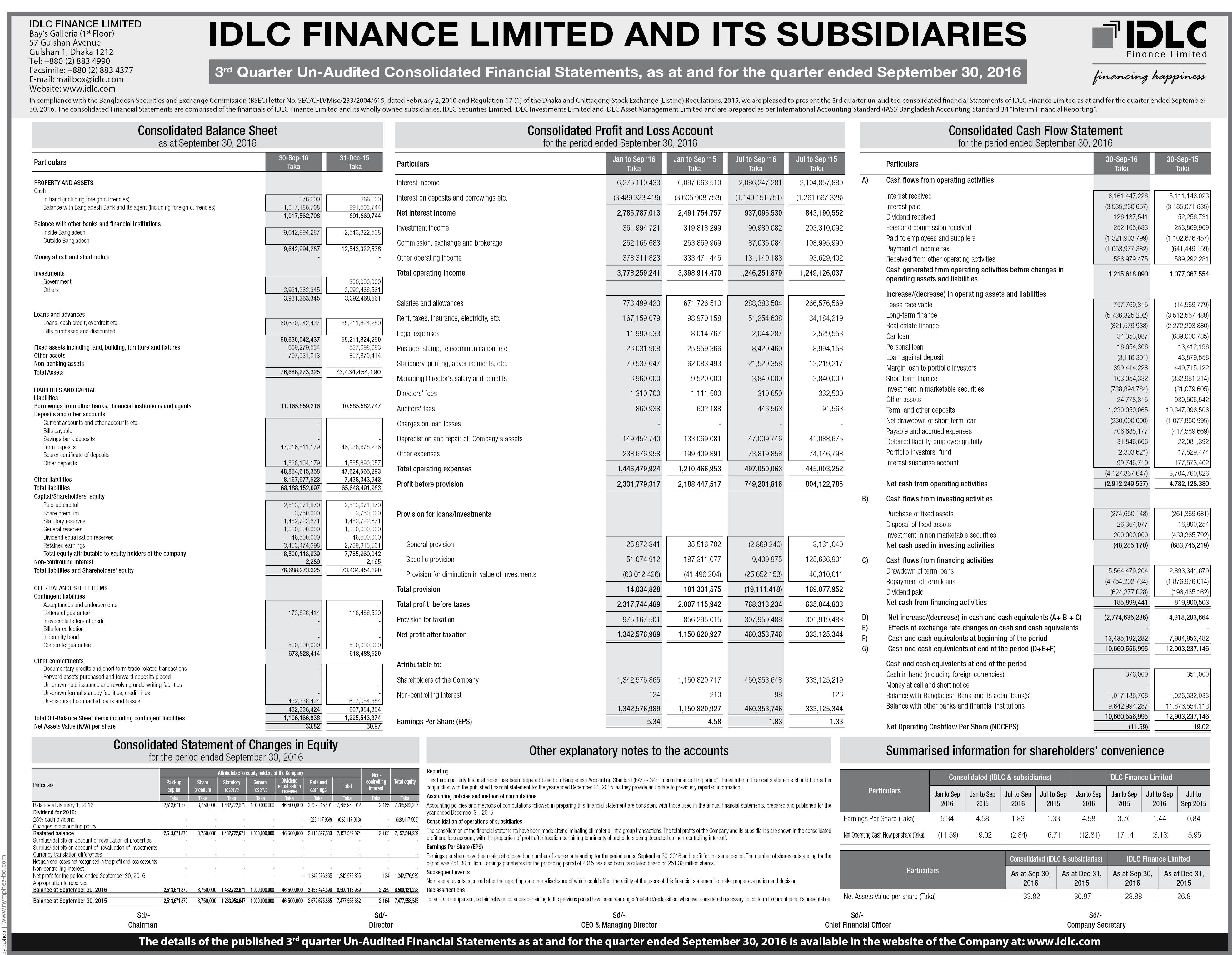 IDLC Finance Ltd 3Q Financial Statements 2016
