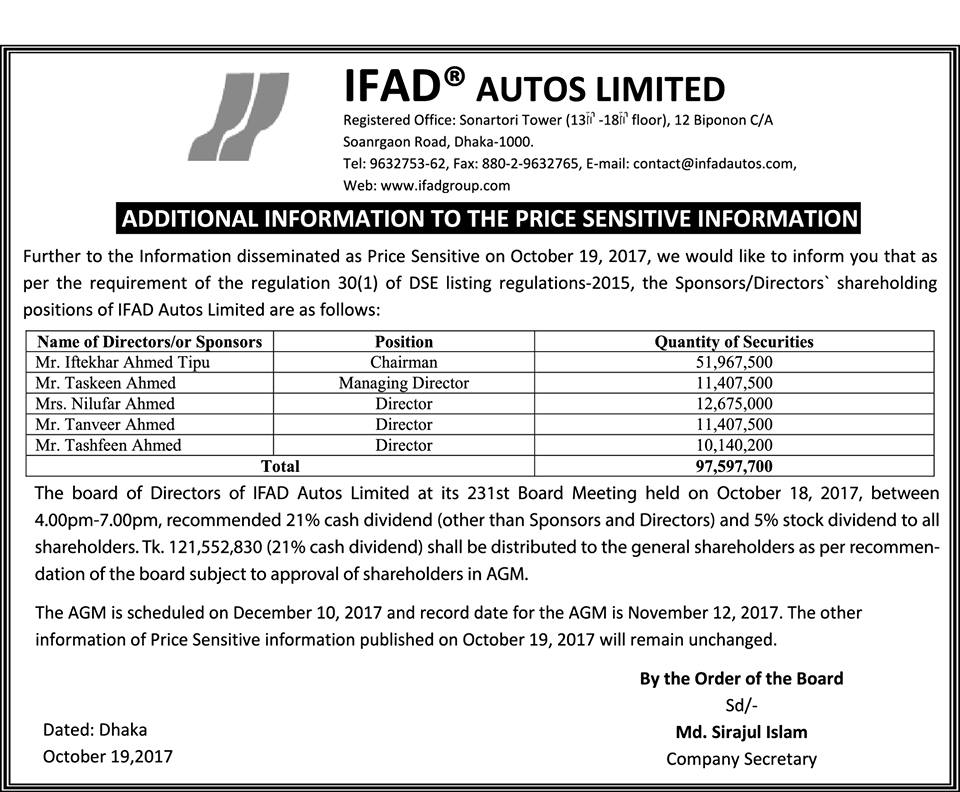 IFAD Autos Limited Additional Information to the Price Sensitive Information