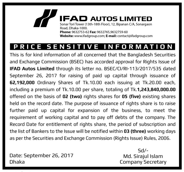 IFAD Autos Limited Additional Information to the Price Sensitive Information