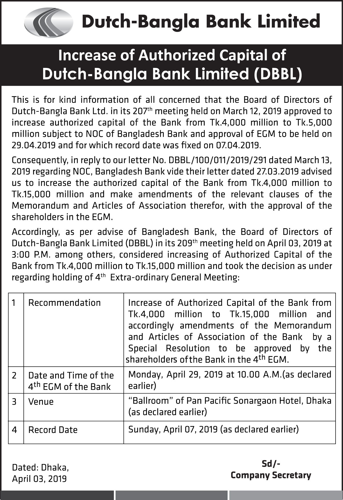 Increase of Authorized Capital of Dutch-Bangla Bank Limited