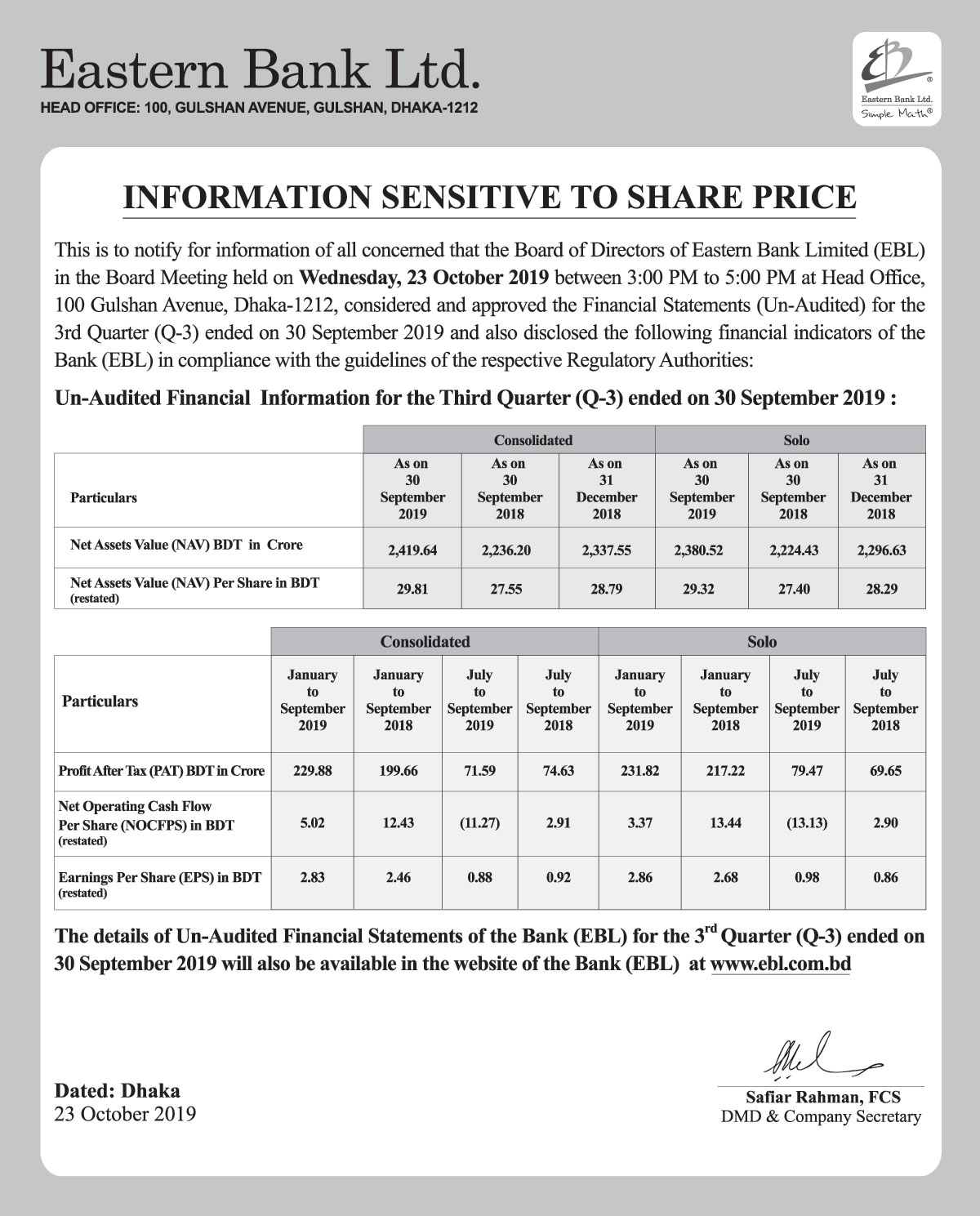 Price Sensitive Information of Eastern Bank Limited
