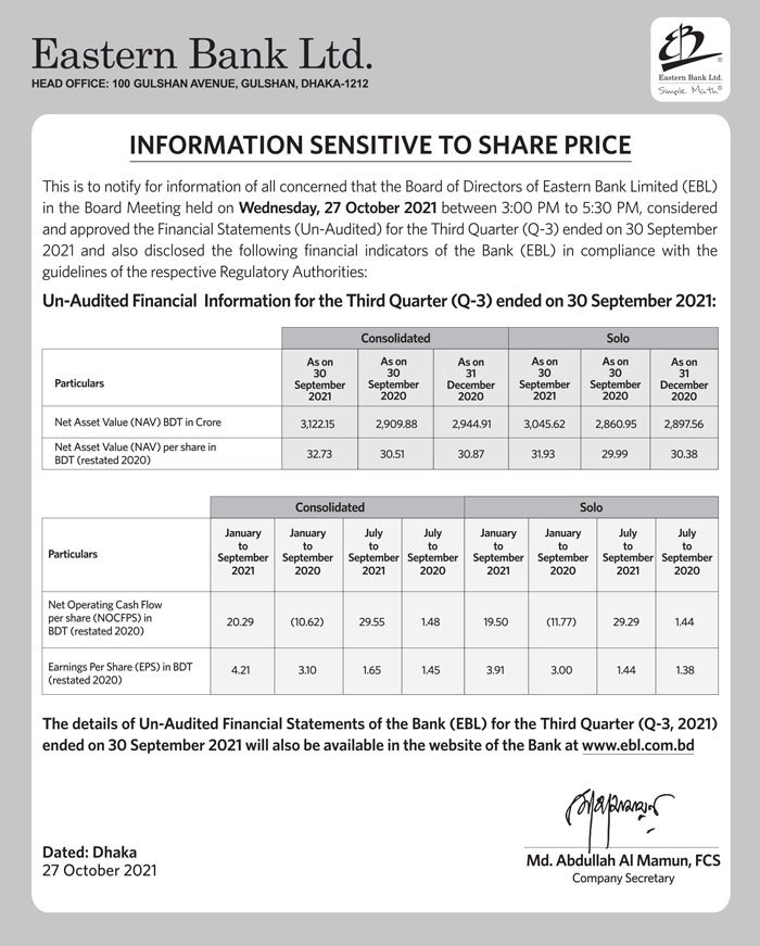 Information Sensitive to Share Price of Eastern Bank Ltd