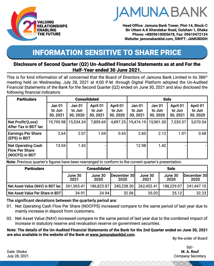 Information Sensitive to Share Price (Q2) of Jamuna Bank