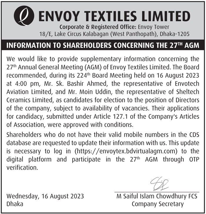 Information to Shareholders Concerning the 27th AGM of Envoy Textiles Limited