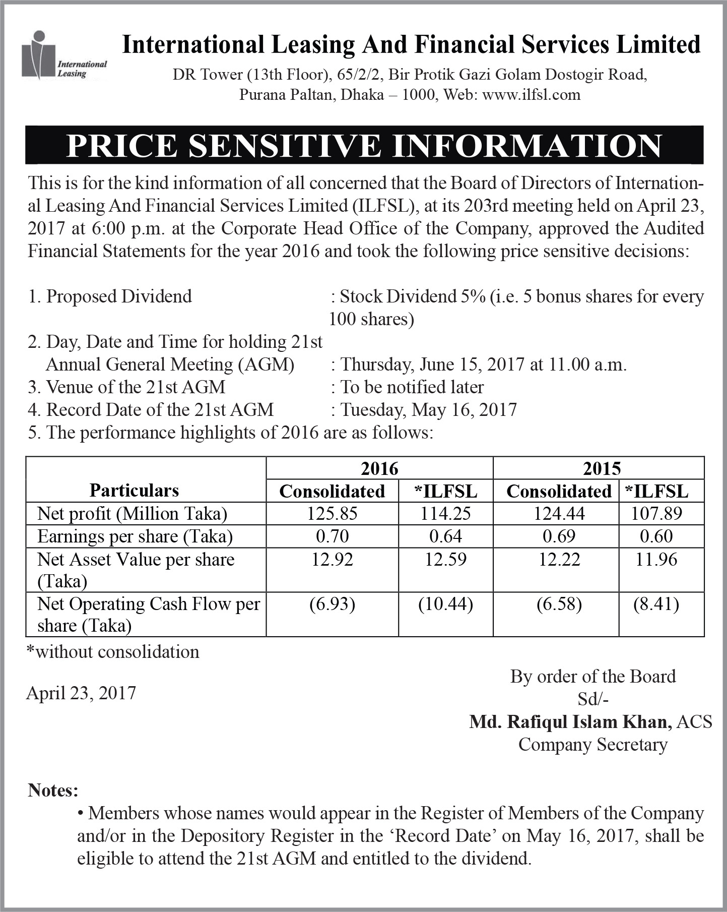 Price Sensitive Information of International Leasing And Financial Services Limited