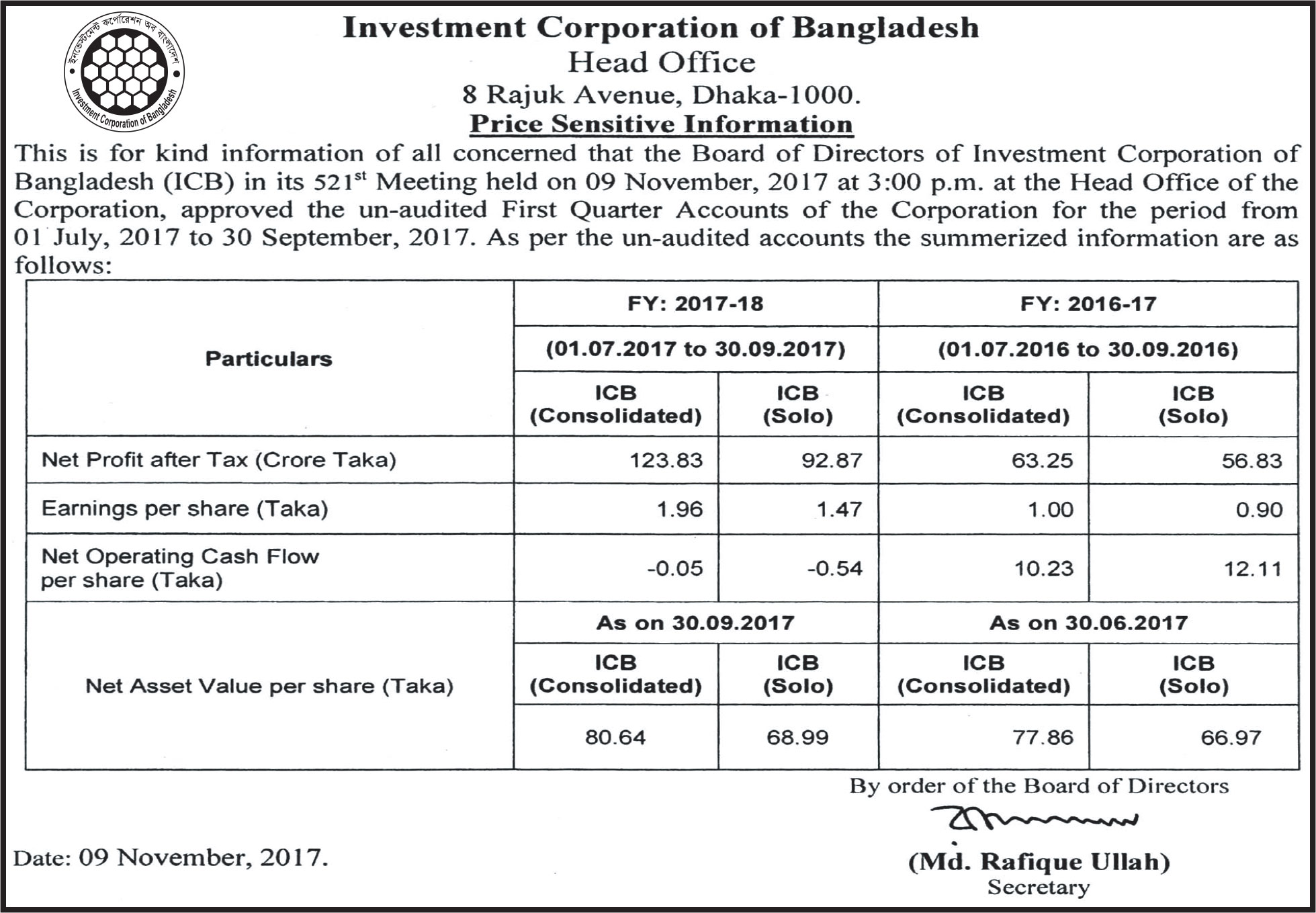 Investment Corporation of Bangladesh Price Sensitive Information