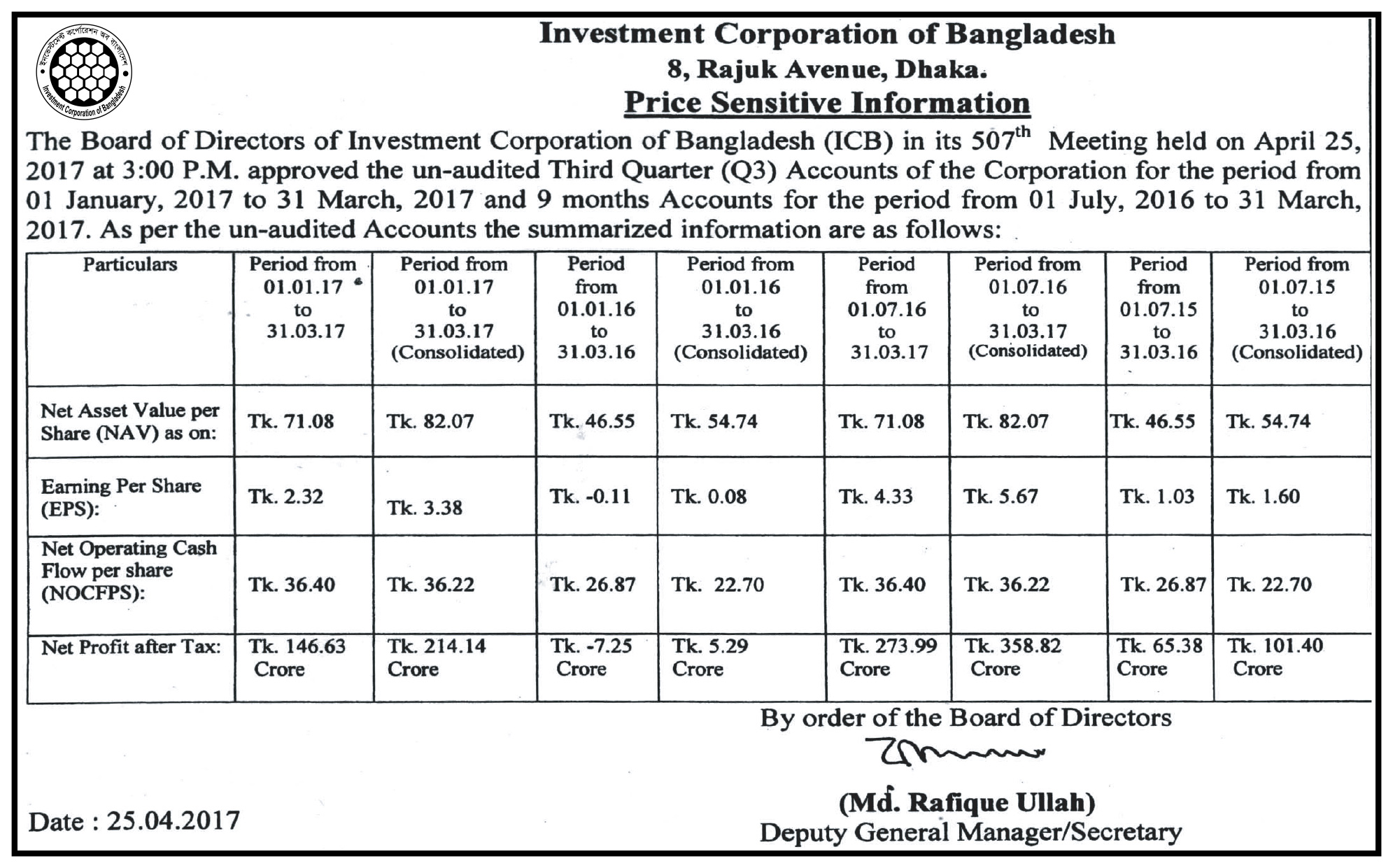 Price Sensitive Information of Investment Corporation of Bangladesh (ICB)