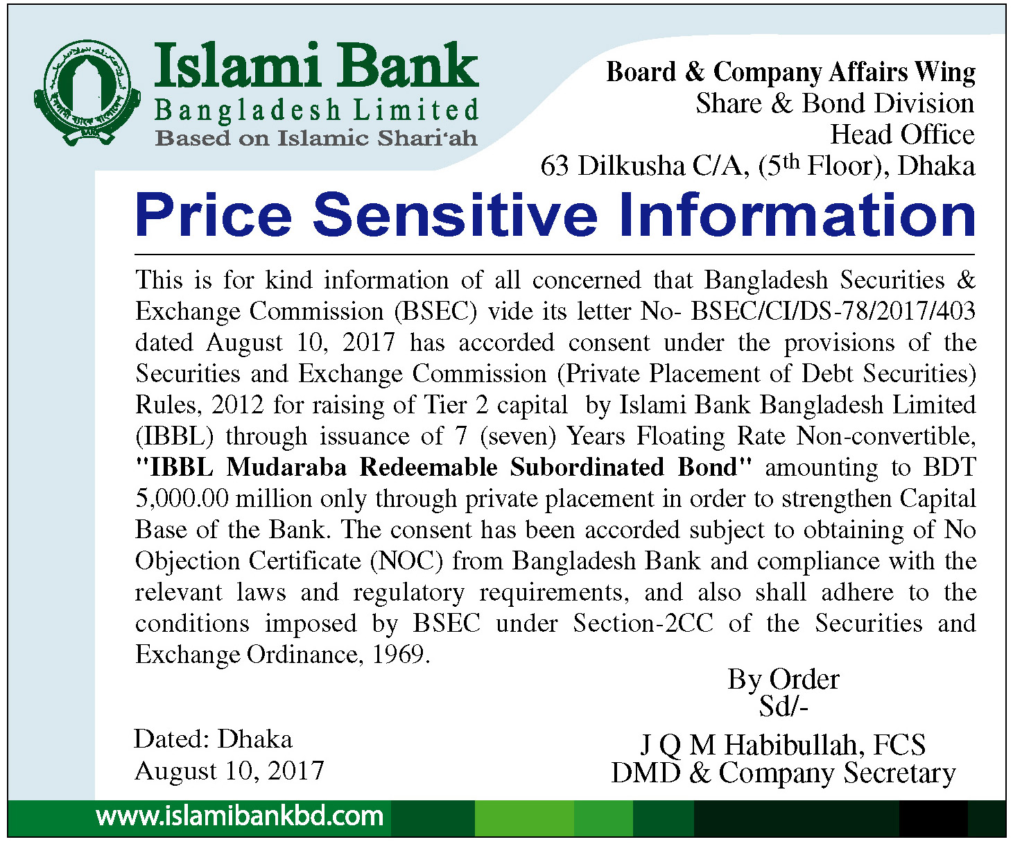 Islami Bank Bangladesh Ltd. Price Sensitive Information