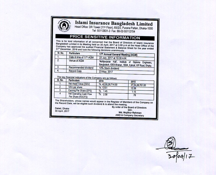 Price Sensitive Information of Islami Insurance Bangladesh Limited