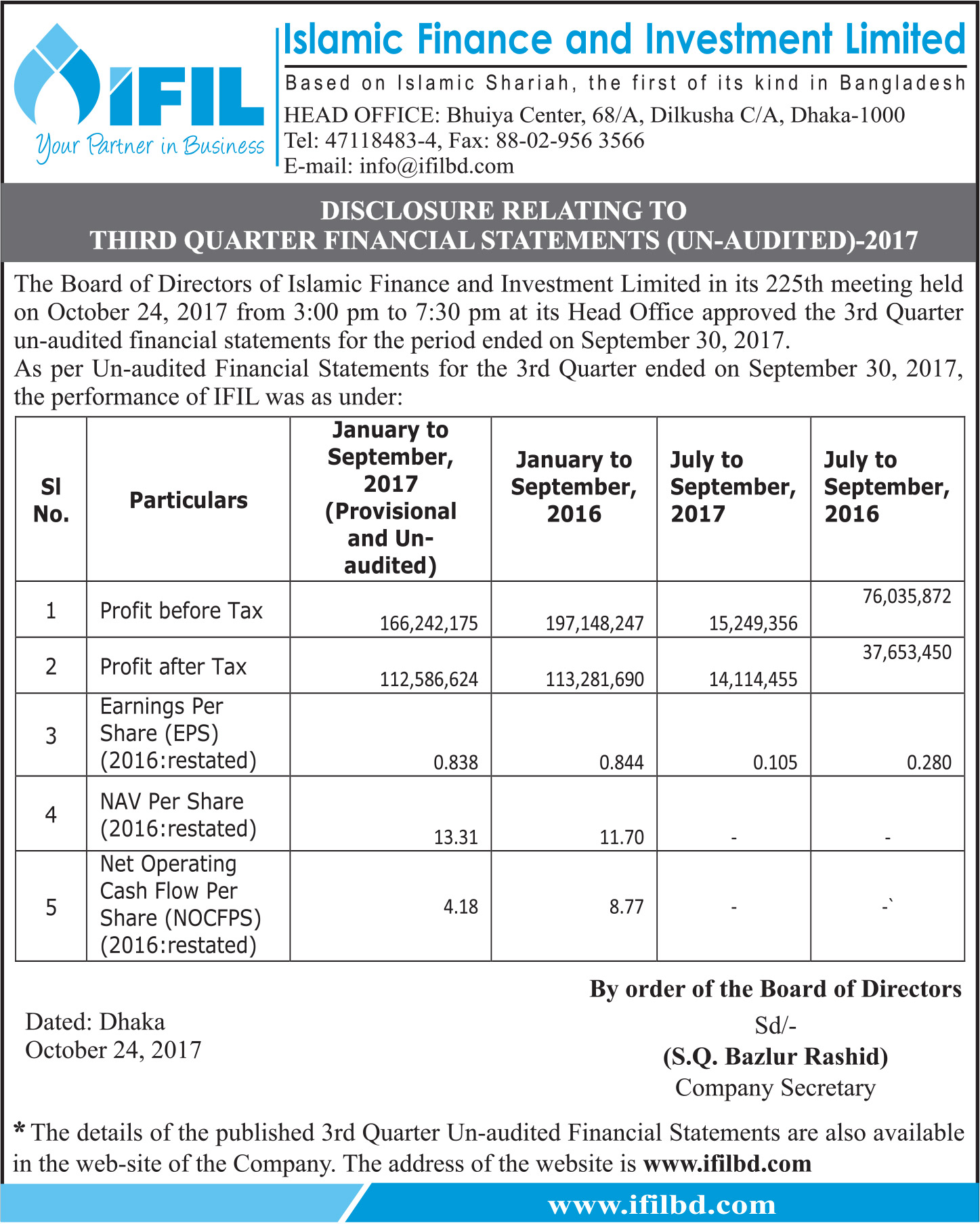 Q3 Un-audited Financial Statements of Islamic Finance & Investment Ltd.