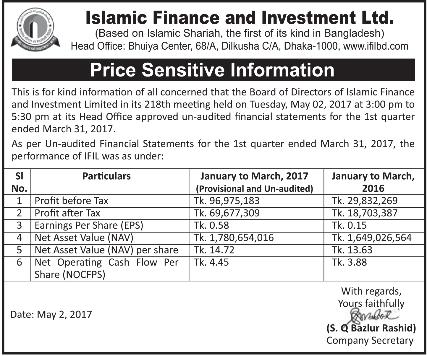 Price Sensitive Information of Islamic Finance & Investment Ltd