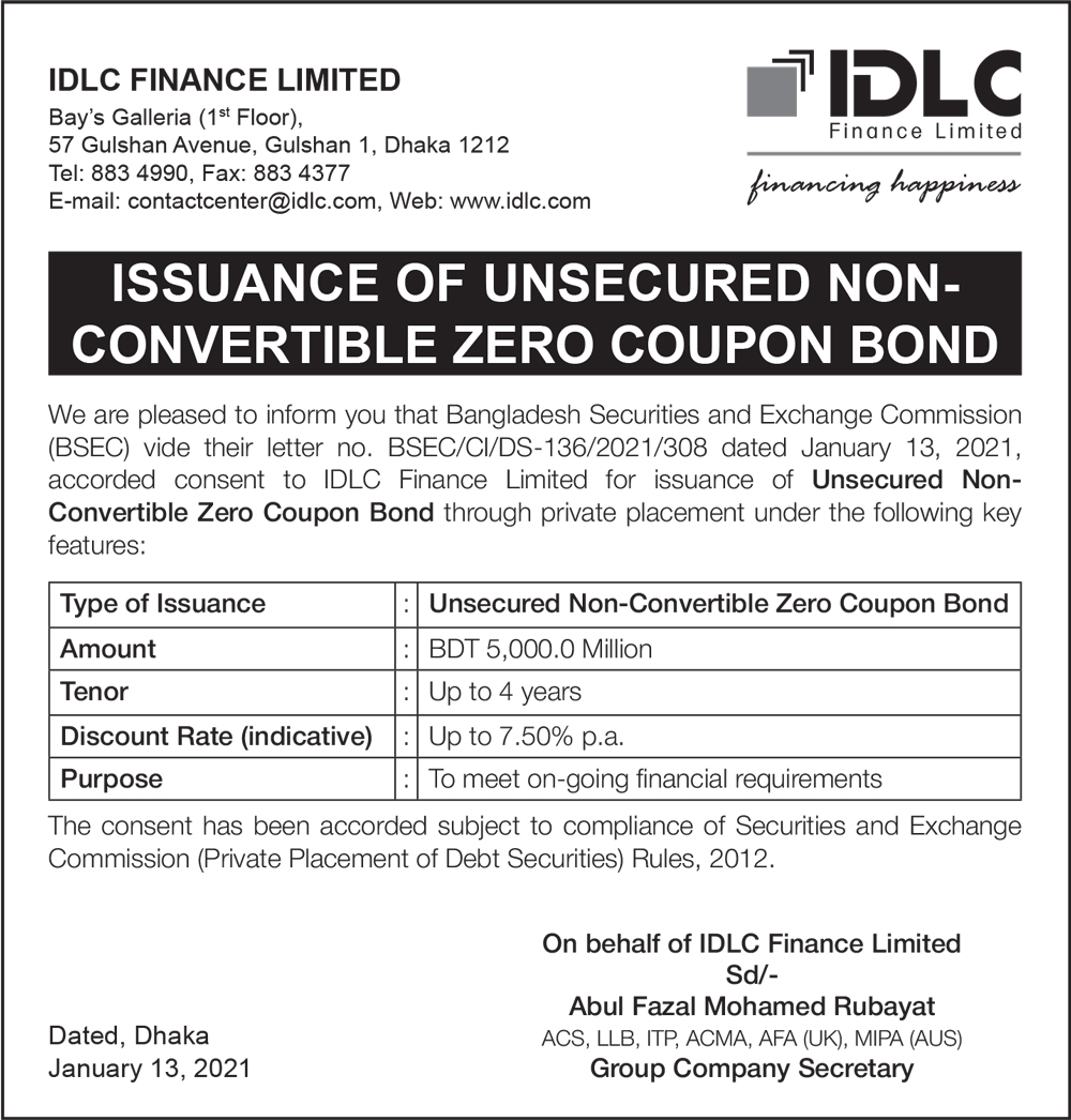 Issuance of Unsecured Non-Convertible Zero Coupon Bond of IDLC Finance Ltd
