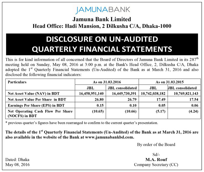 This is for kind information of all concerned that the Board of Directors of Jamuna Bank Limited in its 287th meeting held on Sunday, May 08, 2016 at 3:00 p.m. at the Bank’s Head Office, 2, Dilkusha C/A, Dhaka adopted the 1st Quarterly Financial Statements (Un-Audited) of the Bank as at March 31, 2016 and also disclosed the following financial indicators: