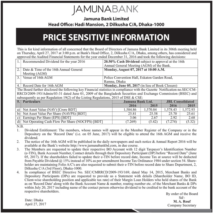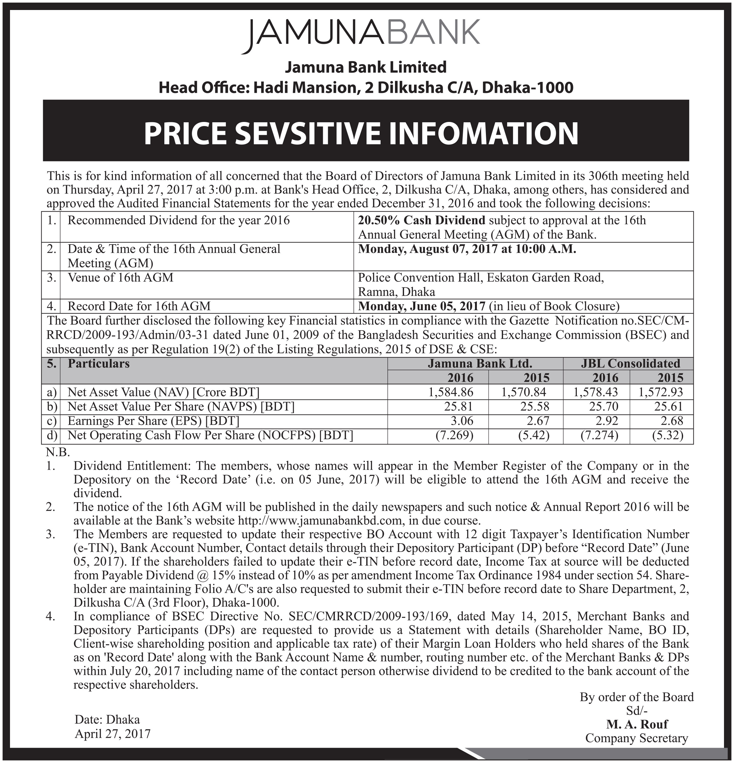 Information Sensitive to Share Price (Q2) of Jamuna Bank