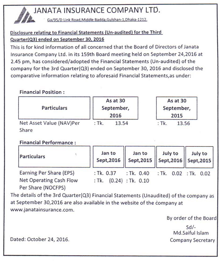 Disclosure Relating to Financial Statements (Un-audited) for the 2Q of Janata Insurance Company Ltd.