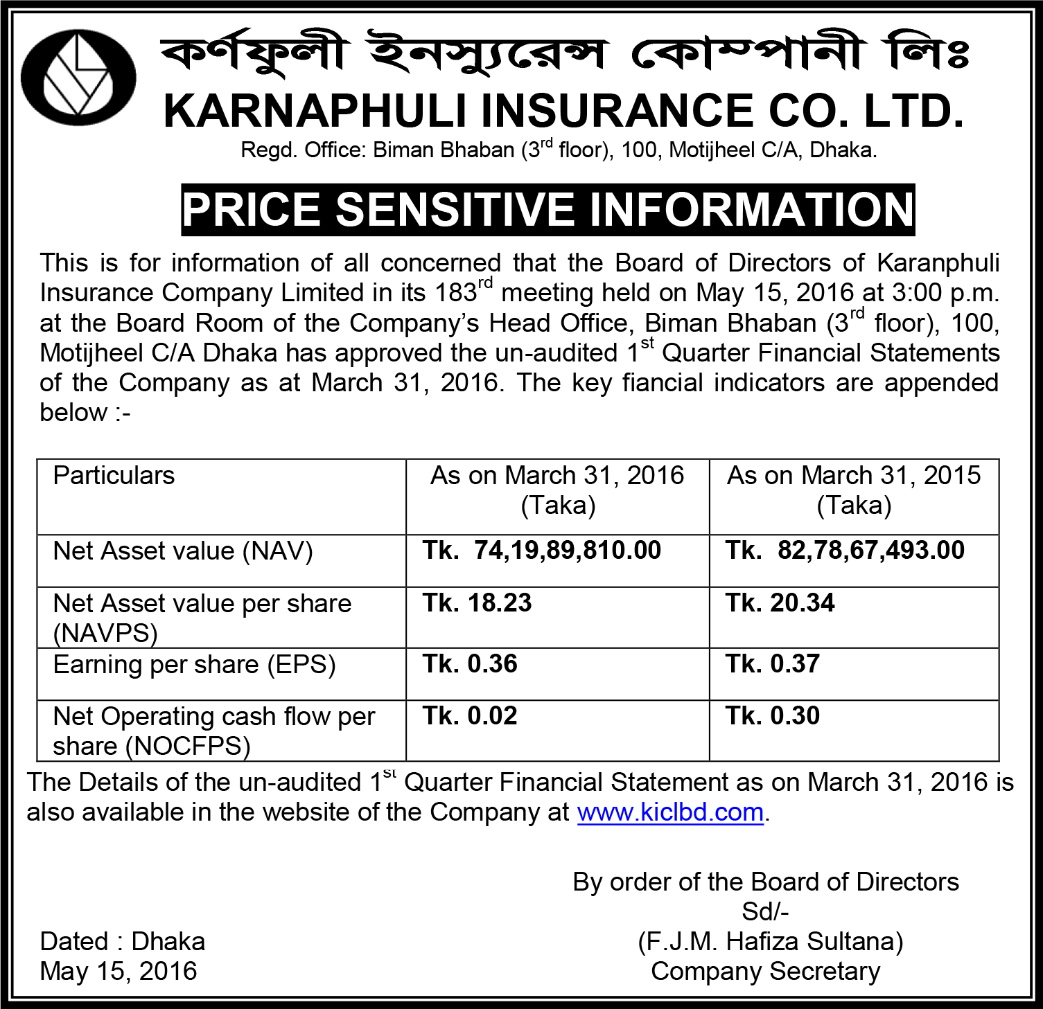 This is for information of all concerned that the Board of Directors of Karanphuli Insurance Company Limited in its 183 rd meeting held on May 15, 2016 at 3:00 p.m. at the Board Room of the Company’s Head Office, Biman Bhaban (3 rd floor), 100, Motijheel C/A Dhaka has approved the un-audited 1 st Quarter Financial Statements of the Company as at March 31, 2016. The key fiancial indicators are appended below :-