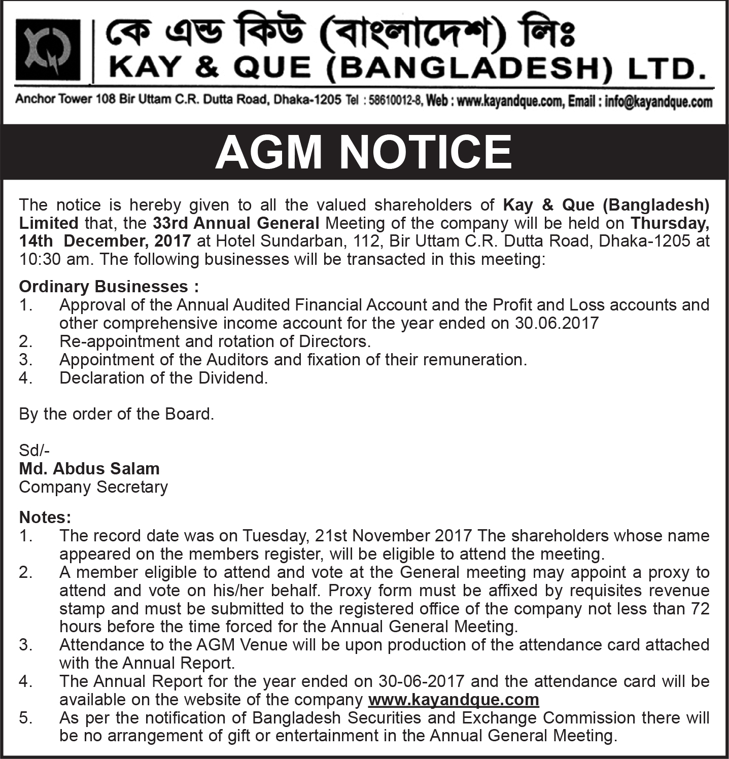 Kay & Que (Bangladesh) Ltd. AGM Notice