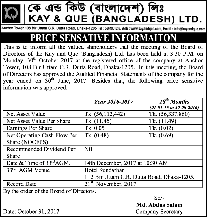 Kay and Que (Bangladesh) Limited Price Sensitive Information