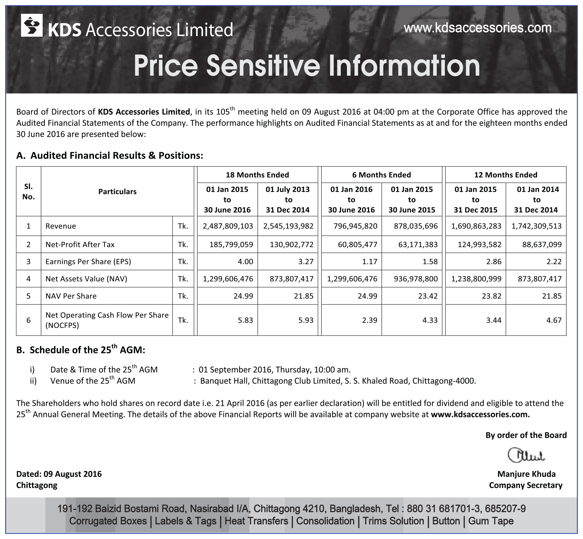 KDS ACCESSORIES LIMITED PRICE SENSITIVE INFORMATION