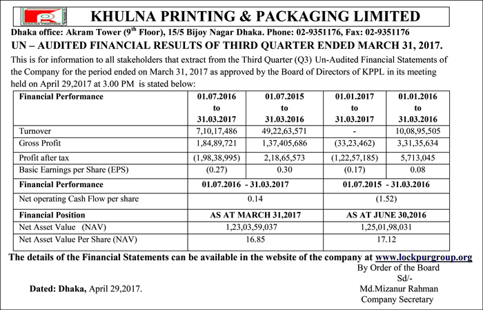 Khulna Printing & Packaging Limited 3Q Financial Statements 2017
