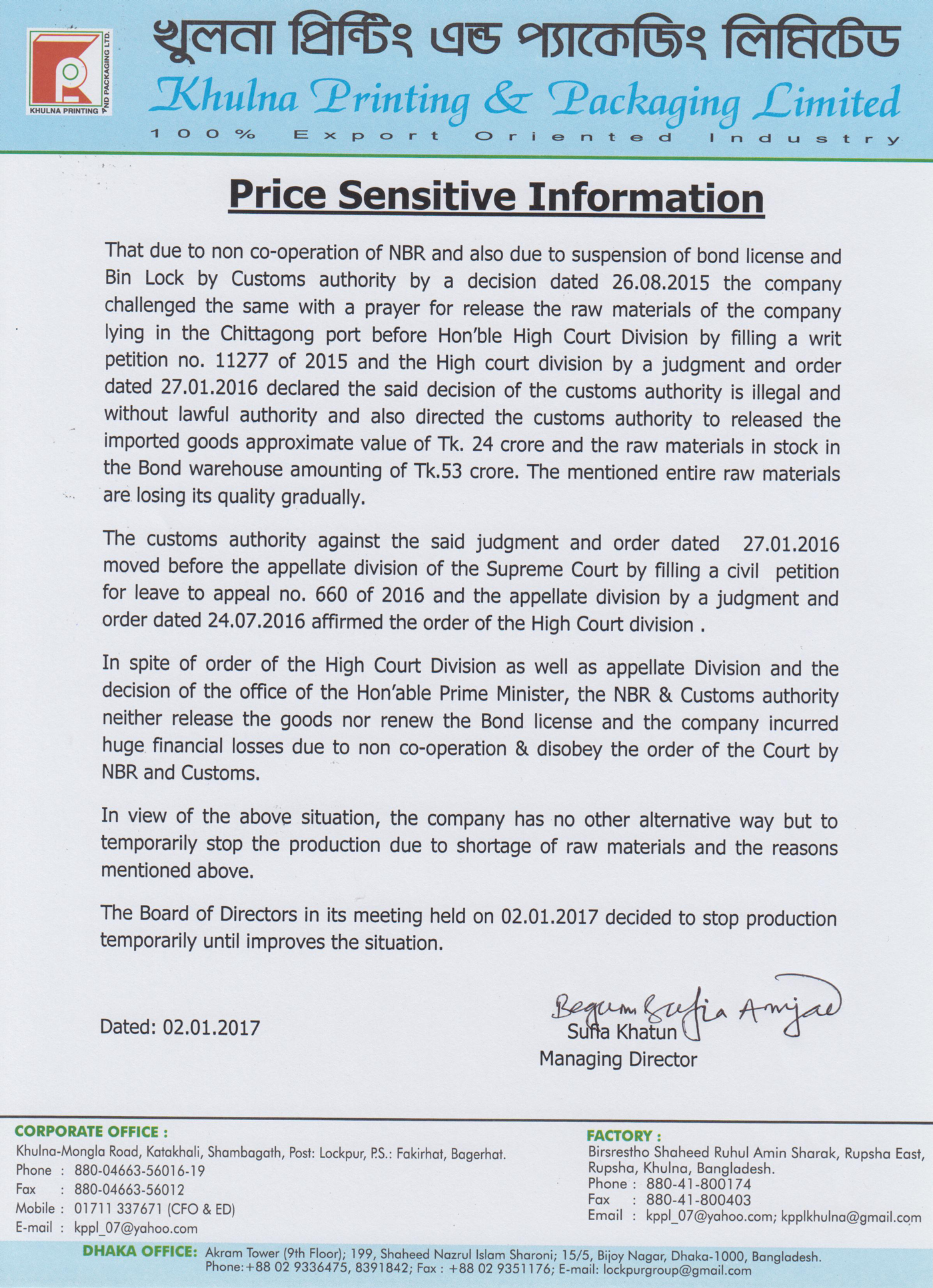 Khulna Printing & Packaging Limited Price Sensitive Information