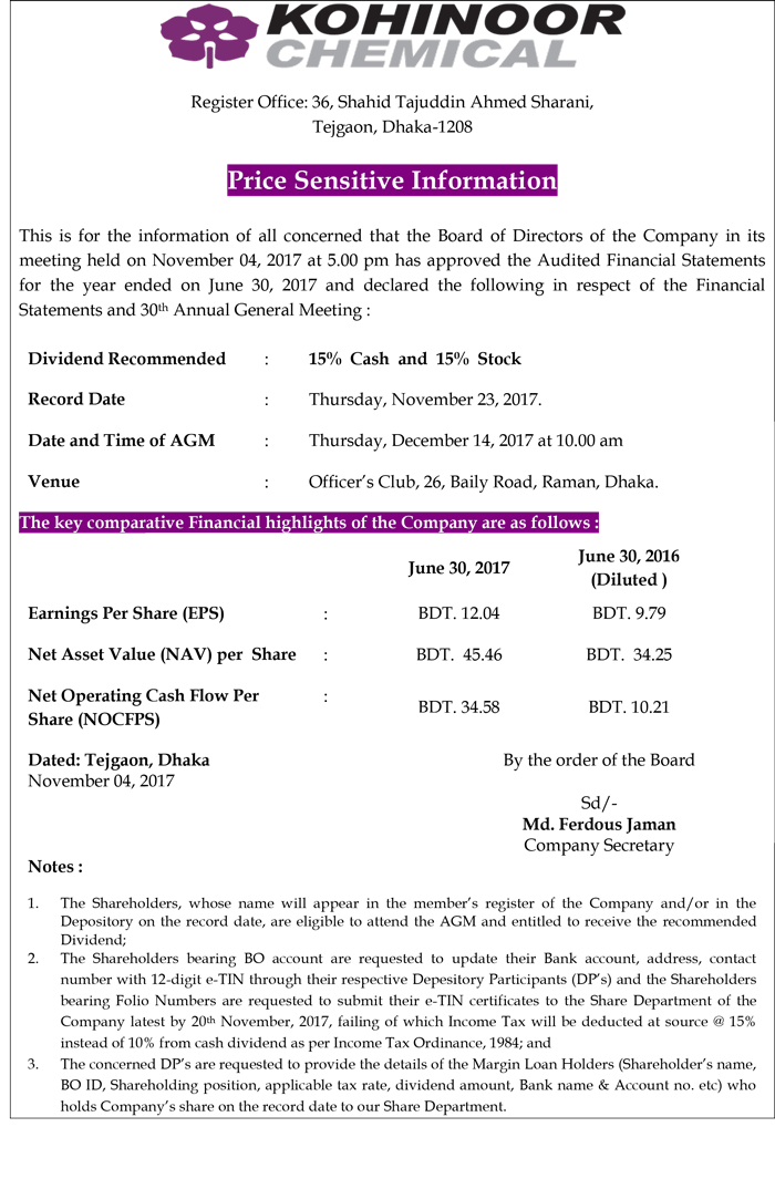 Price Sensitive Information of Kohinoor Chemical Company (Bangladesh) Limited