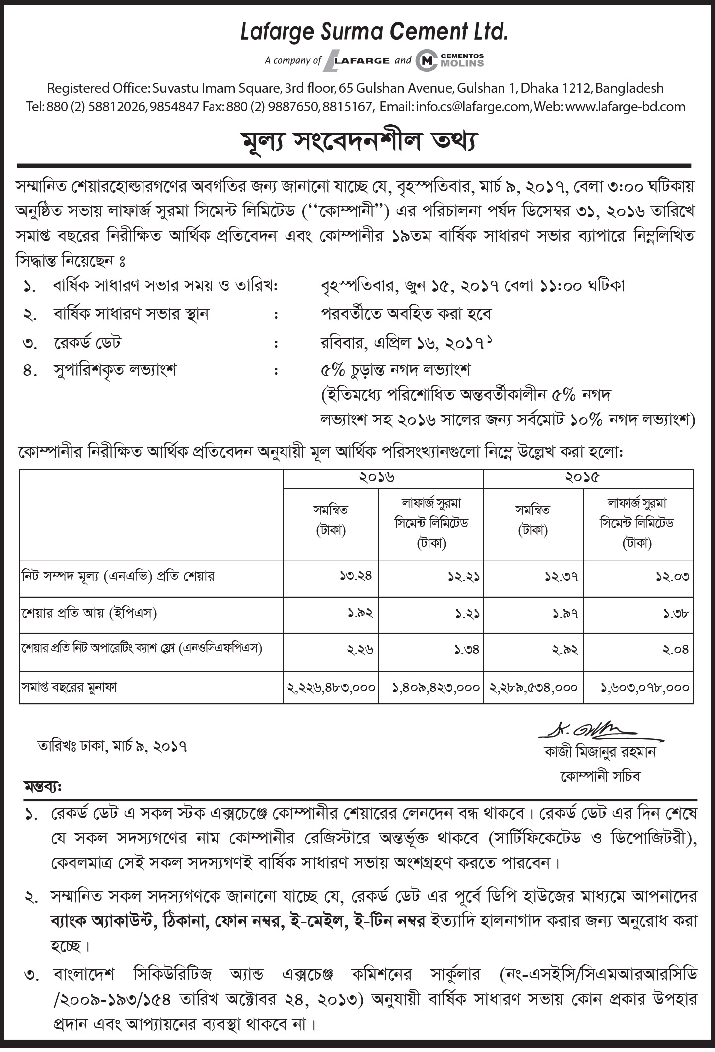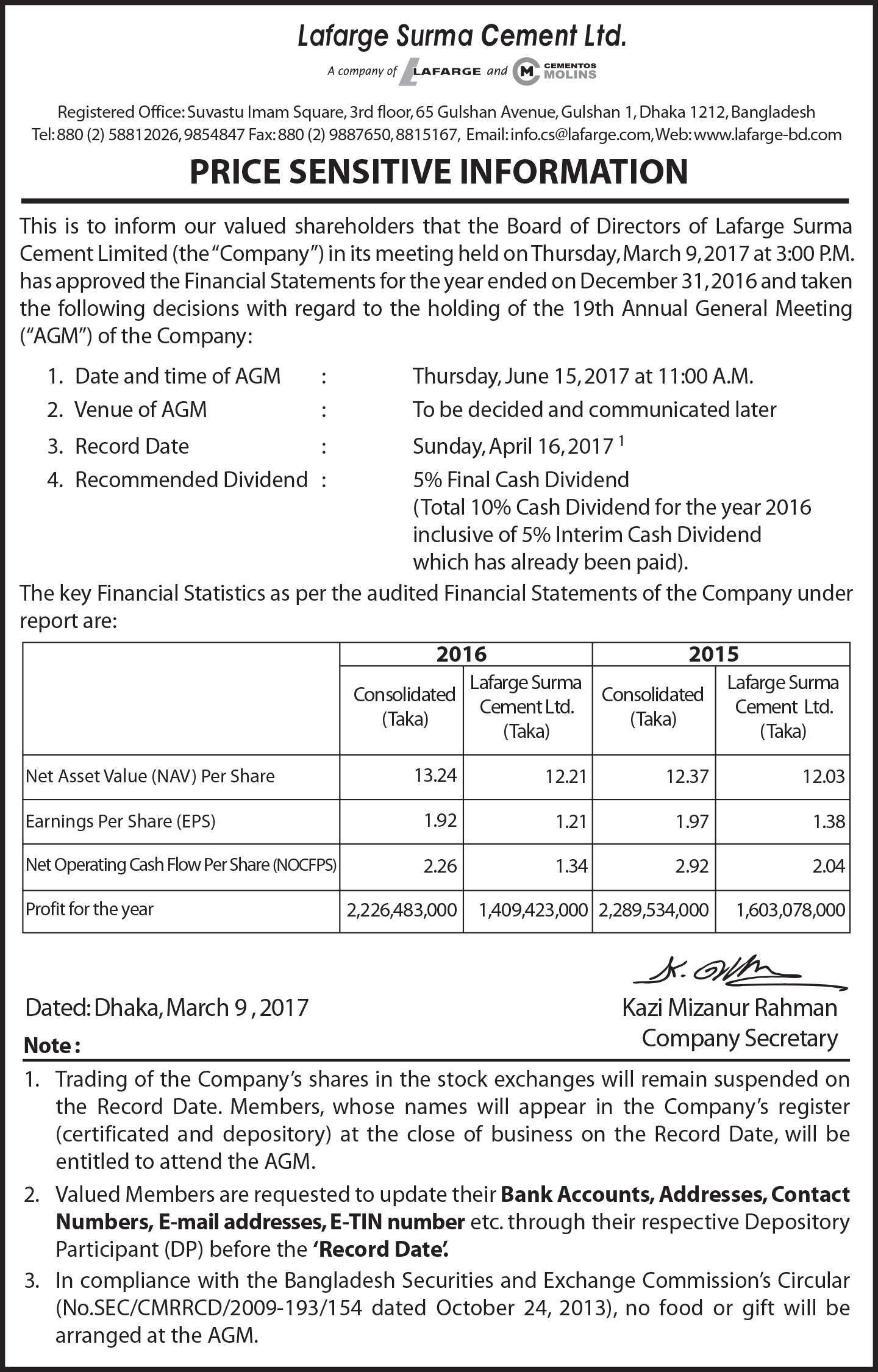 LAFARGE SURMA CEMENT LTD PRICE SENSITIVE INFORMATION MARCH 2017