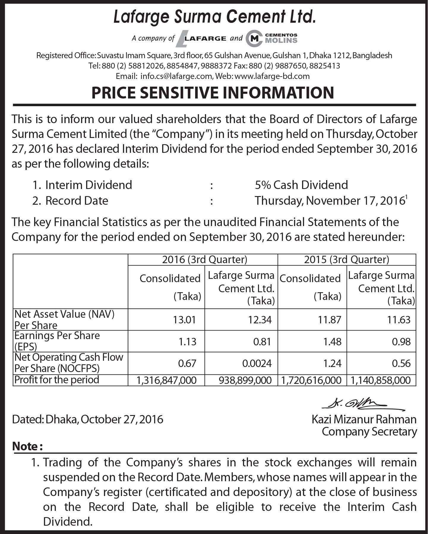Information to the Shareholders and other Concerned of LafargeHolcim Bangladesh Limited