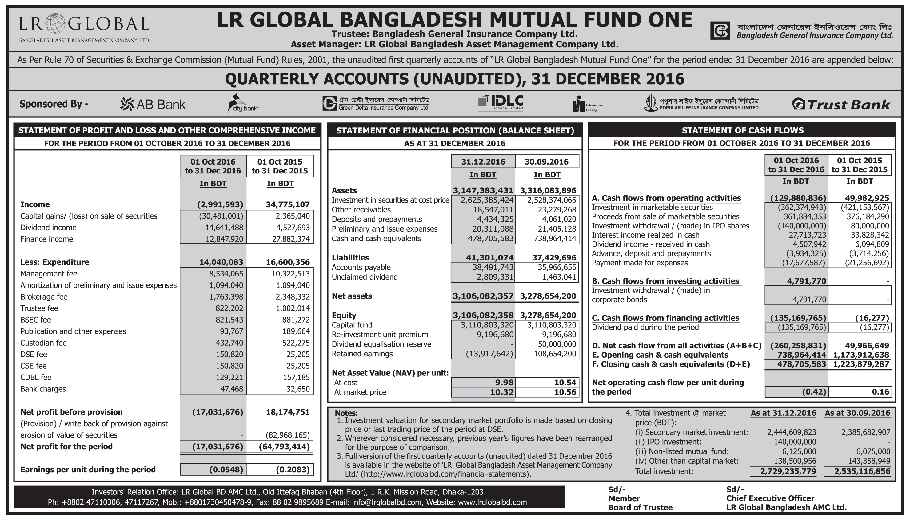 LR Global Bangladesh Mutual Fund One Quarterly Accounts December 2016